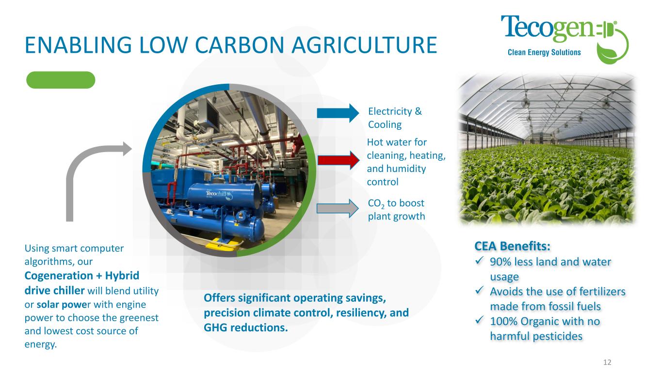 ENABLING LOW CARBON AGRICULTURE 12 Offers significant operating savings, precision climate control, resiliency, and GHG reductions. Electricity & Cooling Using smart computer algorithms, our Cogeneration + Hybrid drive chiller will blend utility or solar power with engine power to choose the greenest and lowest cost source of energy. Hot water for cleaning, heating, and humidity control CO2 to boost plant growth CEA Benefits: ✓ 90% less land and water usage ✓ Avoids the use of fertilizers made from fossil fuels ✓ 100% Organic with no harmful pesticides