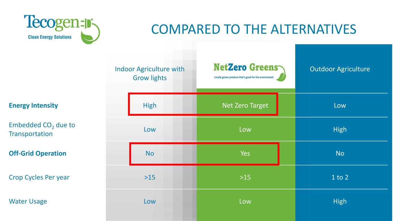 Indoor Agriculture with Grow lights Outdoor Agriculture Energy Intensity High Net Zero Target Low Embedded CO2 due to Transportation Low Low High Off-Grid Operation No Yes No Crop Cycles Per year >15 >15 1 to 2 Water Usage Low Low High COMPARED TO THE ALTERNATIVES