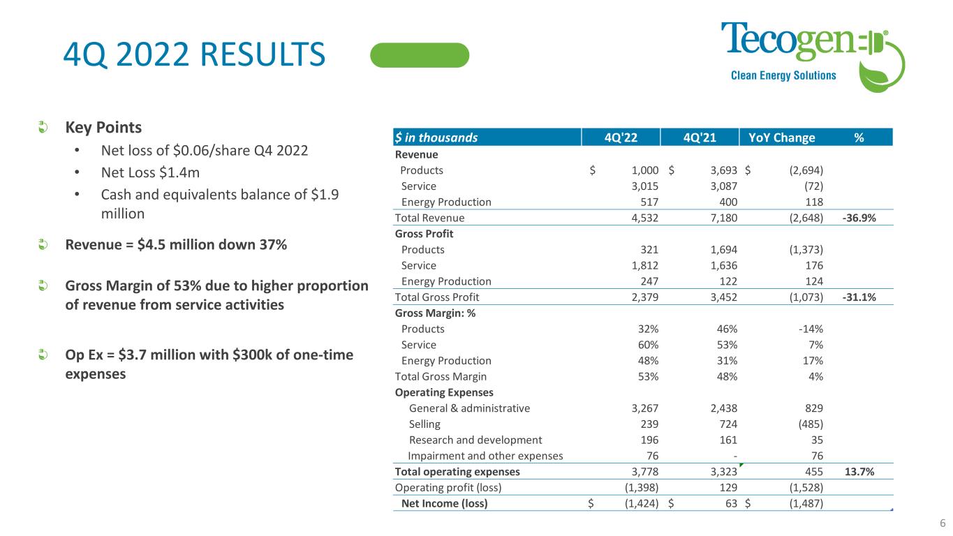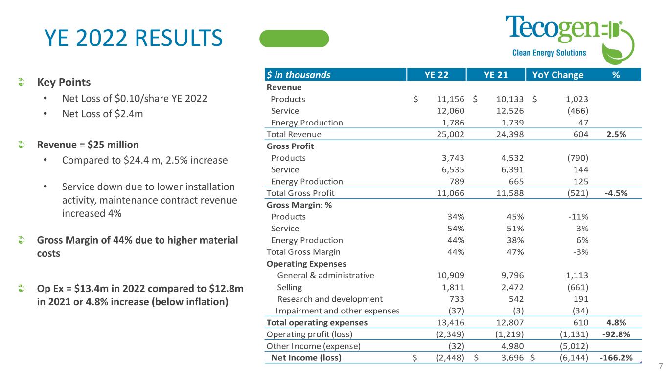 4Q 2022 RESULTS Key Points • Net loss of $0.06/share Q4 2022 • Net Loss $1.4m • Cash and equivalents balance of $1.9 million Revenue = $4.5 million down 37% Gross Margin of 53% due to higher proportion of revenue from service activities Op Ex = $3.7 million with $300k of one-time expenses 6 $ in thousands 4Q'22 4Q'21 YoY Change % Revenue Products $ 1,000 $ 3,693 $ (2,694) Service 3,015 3,087 (72) Energy Production 517 400 118 Total Revenue 4,532 7,180 (2,648) -36.9% Gross Profit Products 321 1,694 (1,373) Service 1,812 1,636 176 Energy Production 247 122 124 Total Gross Profit 2,379 3,452 (1,073) -31.1% Gross Margin: % Products 32% 46% -14% Service 60% 53% 7% Energy Production 48% 31% 17% Total Gross Margin 53% 48% 4% Operating Expenses General & administrative 3,267 2,438 829 Selling 239 724 (485) Research and development 196 161 35 Impairment and other expenses 76 - 76 Total operating expenses 3,778 3,323 455 13.7% Operating profit (loss) (1,398) 129 (1,528) -1182.8% Net Income (loss) $ (1,424) $ 63 $ (1,487) -2362.2%