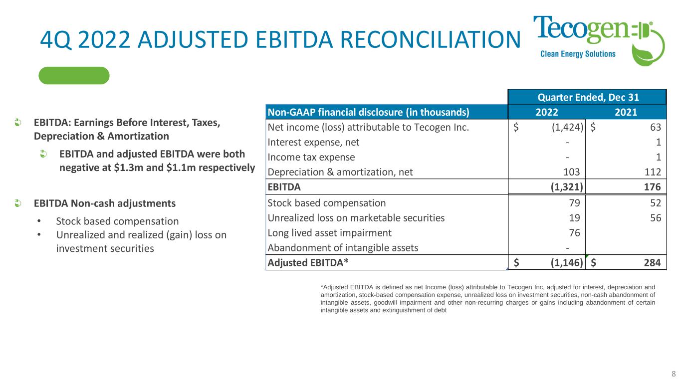 YE 2022 RESULTS Key Points • Net Loss of $0.10/share YE 2022 • Net Loss of $2.4m Revenue = $25 million • Compared to $24.4 m, 2.5% increase • Service down due to lower installation activity, maintenance contract revenue increased 4% Gross Margin of 44% due to higher material costs Op Ex = $13.4m in 2022 compared to $12.8m in 2021 or 4.8% increase (below inflation) 7 $ in thousands YE 22 YE 21 YoY Change % Revenue Products $ 11,156 $ 10,133 $ 1,023 Service 12,060 12,526 (466) Energy Production 1,786 1,739 47 Total Revenue 25,002 24,398 604 2.5% Gross Profit Products 3,743 4,532 (790) Service 6,535 6,391 144 Energy Production 789 665 125 Total Gross Profit 11,066 11,588 (521) -4.5% Gross Margin: % Products 34% 45% -11% Service 54% 51% 3% Energy Production 44% 38% 6% Total Gross Margin 44% 47% -3% Operating Expenses General & administrative 10,909 9,796 1,113 Selling 1,811 2,472 (661) Research and development 733 542 191 Impairment and other expenses (37) (3) (34) Total operating expenses 13,416 12,807 610 4.8% Operating profit (loss) (2,349) (1,219) (1,131) -92.8% Other Income (expense) (32) 4,980 (5,012) Net Income (loss) $ (2,448) $ 3,696 $ (6,144) -166.2%