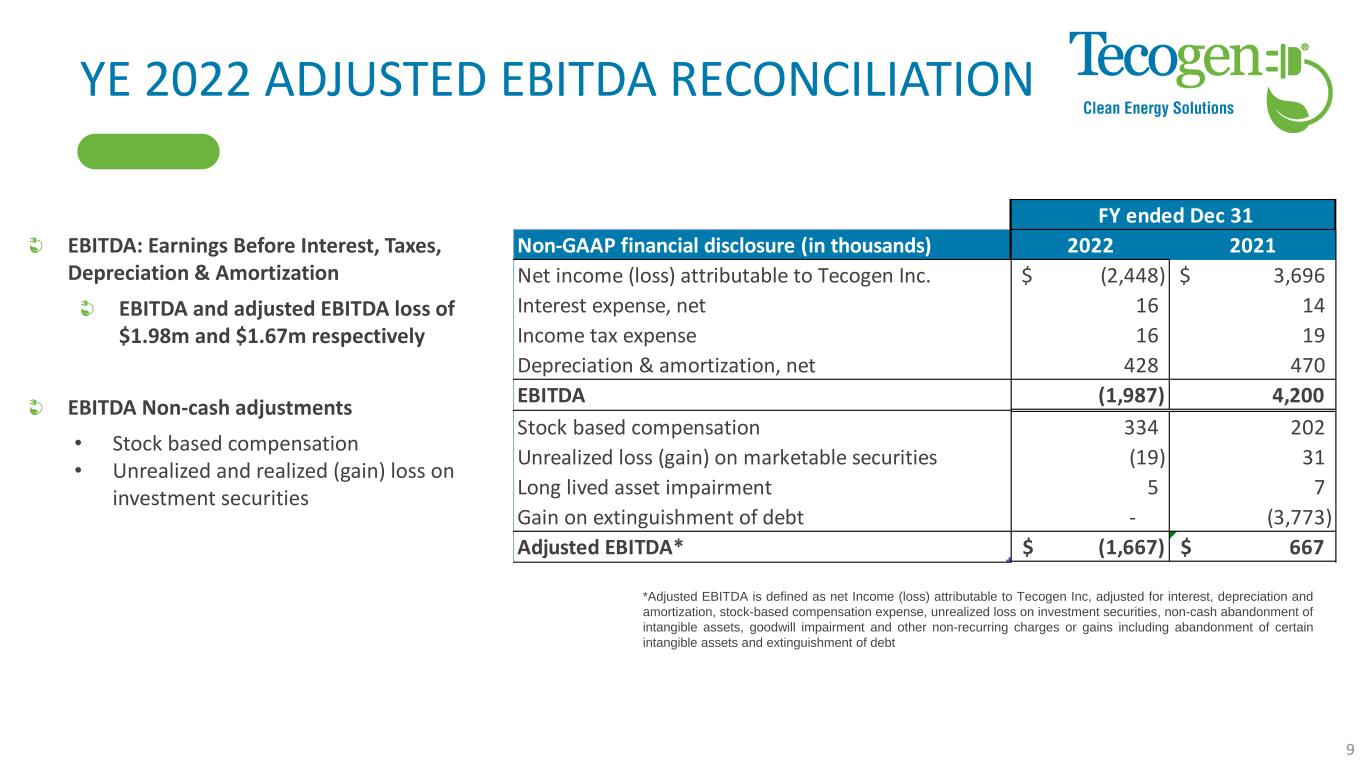 4Q 2022 ADJUSTED EBITDA RECONCILIATION EBITDA: Earnings Before Interest, Taxes, Depreciation & Amortization EBITDA and adjusted EBITDA were both negative at $1.3m and $1.1m respectively EBITDA Non-cash adjustments • Stock based compensation • Unrealized and realized (gain) loss on investment securities *Adjusted EBITDA is defined as net Income (loss) attributable to Tecogen Inc, adjusted for interest, depreciation and amortization, stock-based compensation expense, unrealized loss on investment securities, non-cash abandonment of intangible assets, goodwill impairment and other non-recurring charges or gains including abandonment of certain intangible assets and extinguishment of debt 8 Non-GAAP financial disclosure (in thousands) 2022 2021 Net income (loss) attributable to Tecogen Inc. (1,424)$ 63$ Interest expense, net - 1 Income tax expense - 1 Depreciation & amortization, net 103 112 EBITDA (1,321) 176 Stock based compensation 79 52 Unrealized loss on marketable securities 19 56 Long lived asset impairment 76 Abandonment of intangible assets - Adjusted EBITDA* (1,146)$ 284$ Quarter Ended, Dec 31