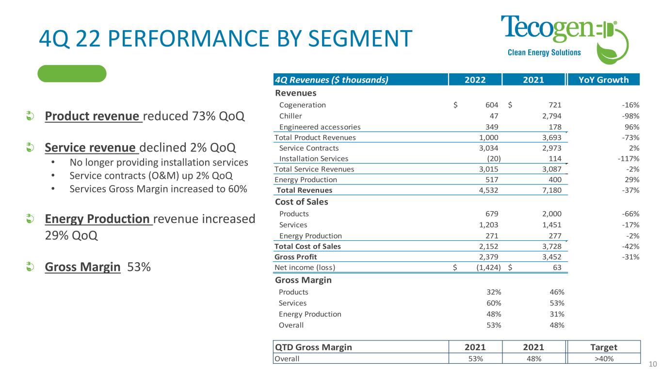 YE 2022 ADJUSTED EBITDA RECONCILIATION EBITDA: Earnings Before Interest, Taxes, Depreciation & Amortization EBITDA and adjusted EBITDA loss of $1.98m and $1.67m respectively EBITDA Non-cash adjustments • Stock based compensation • Unrealized and realized (gain) loss on investment securities *Adjusted EBITDA is defined as net Income (loss) attributable to Tecogen Inc, adjusted for interest, depreciation and amortization, stock-based compensation expense, unrealized loss on investment securities, non-cash abandonment of intangible assets, goodwill impairment and other non-recurring charges or gains including abandonment of certain intangible assets and extinguishment of debt 9 Non-GAAP financial disclosure (in thousands) 2022 2021 Net income (loss) attributable to Tecogen Inc. (2,448)$ 3,696$ Interest expense, net 16 14 Income tax expense 16 19 Depreciation & amortization, net 428 470 EBITDA (1,987) 4,200 Stock based compensation 334 202 Unrealized loss (gain) on marketable securities (19) 31 Long lived asset impairment 5 7 Gain on extinguishment of debt - (3,773) Adjusted EBITDA* (1,667)$ 667$ FY ended Dec 31