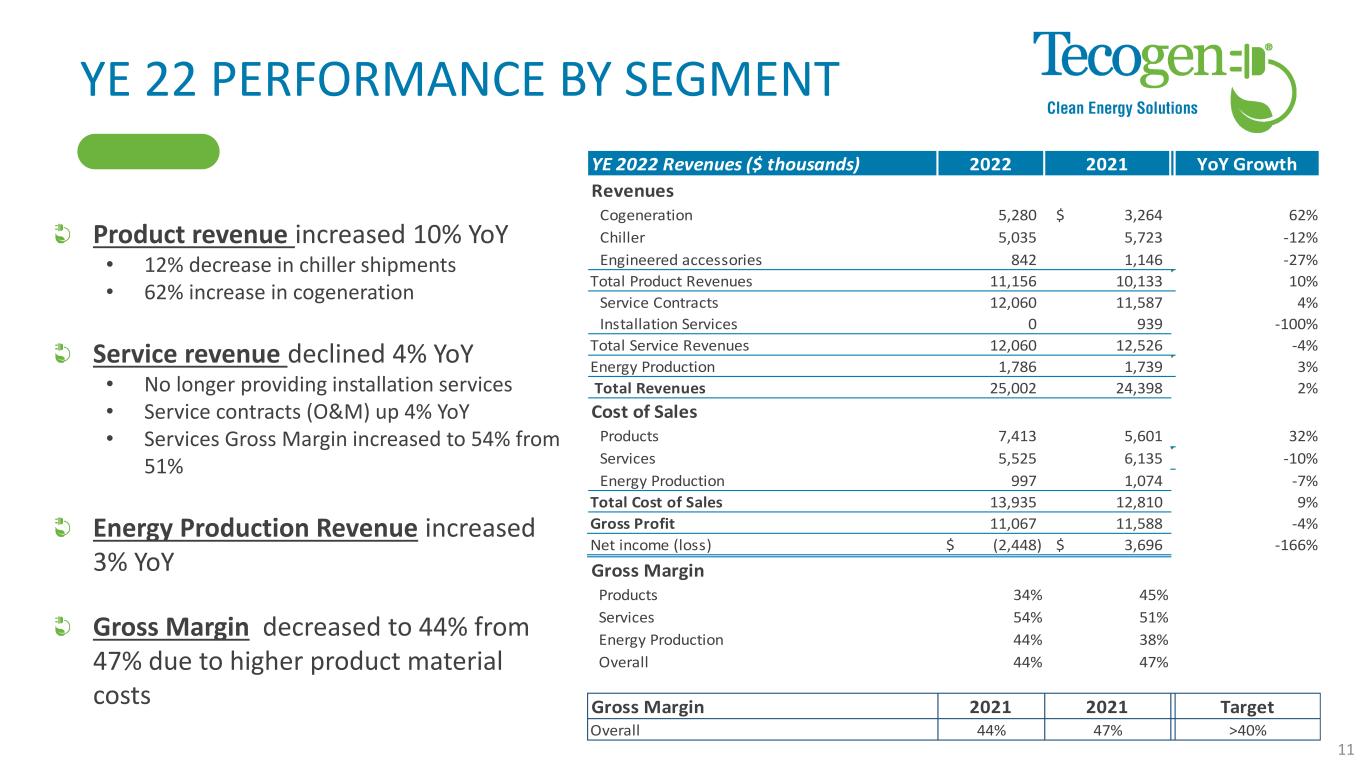 4Q 22 PERFORMANCE BY SEGMENT Product revenue reduced 73% QoQ Service revenue declined 2% QoQ • No longer providing installation services • Service contracts (O&M) up 2% QoQ • Services Gross Margin increased to 60% Energy Production revenue increased 29% QoQ Gross Margin 53% 10 4Q Revenues ($ thousands) 2022 2021 YoY Growth Revenues Cogeneration 604$ 721$ -16% Chiller 47 2,794 -98% Engineered accessories 349 178 96% Total Product Revenues 1,000 3,693 -73% Service Contracts 3,034 2,973 2% Installation Services (20) 114 -117% Total Service Revenues 3,015 3,087 -2% Energy Production 517 400 29% Total Revenues 4,532 7,180 -37% Cost of Sales Products 679 2,000 -66% Services 1,203 1,451 -17% Energy Production 271 277 -2% Total Cost of Sales 2,152 3,728 -42% Gross Profit 2,379 3,452 -31% Net income (loss) (1,424)$ 63$ Gross Margin Products 32% 46% Services 60% 53% Energy Production 48% 31% Overall 53% 48% QTD Gross Margin 2021 2021 Target Overall 53% 48% >40%