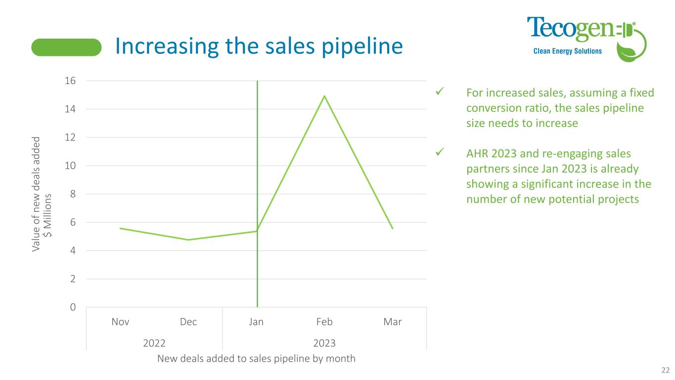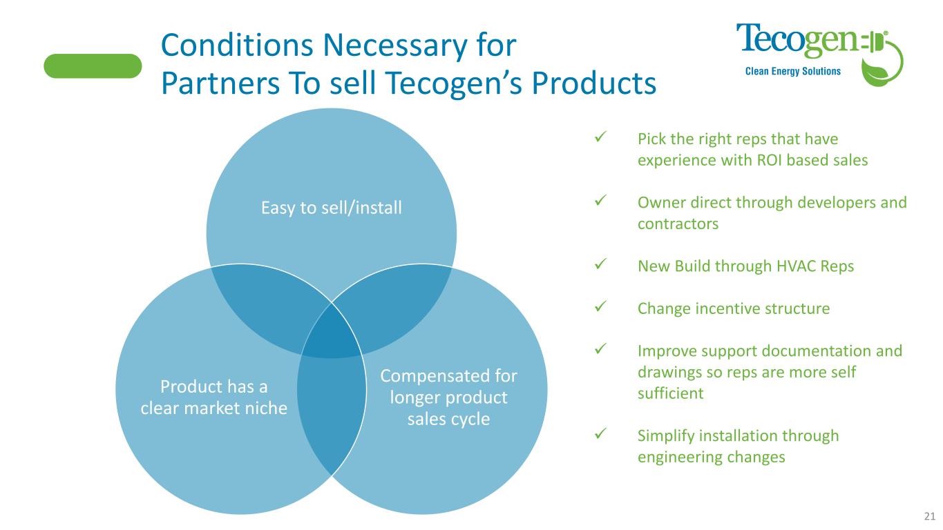 Conditions Necessary for Partners To sell Tecogen’s Products Easy to sell/install Compensated for longer product sales cycle Product has a clear market niche ✓ Pick the right reps that have experience with ROI based sales ✓ Owner direct through developers and contractors ✓ New Build through HVAC Reps ✓ Change incentive structure ✓ Improve support documentation and drawings so reps are more self sufficient ✓ Simplify installation through engineering changes 21