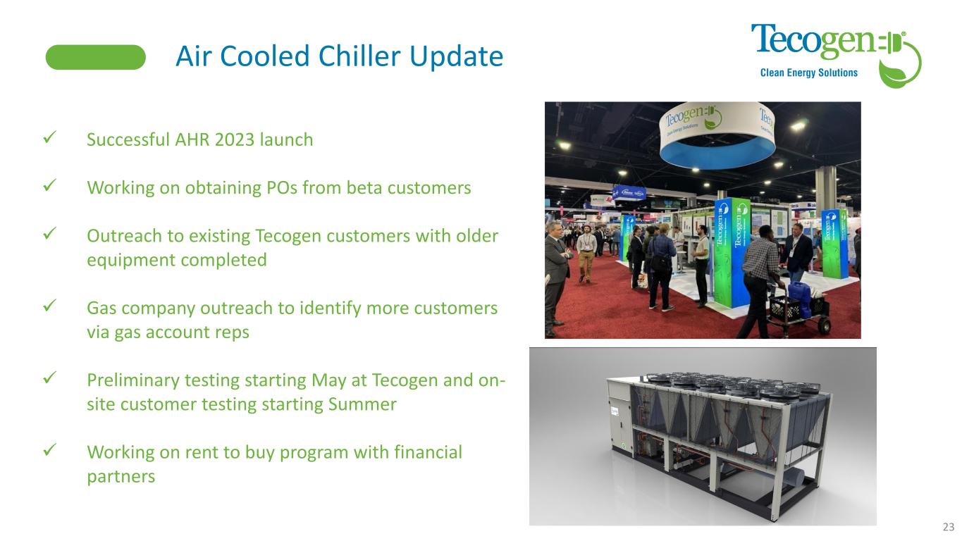 Air Cooled Chiller Update ✓ Successful AHR 2023 launch ✓ Working on obtaining POs from beta customers ✓ Outreach to existing Tecogen customers with older equipment completed ✓ Gas company outreach to identify more customers via gas account reps ✓ Preliminary testing starting May at Tecogen and on- site customer testing starting Summer ✓ Working on rent to buy program with financial partners 23