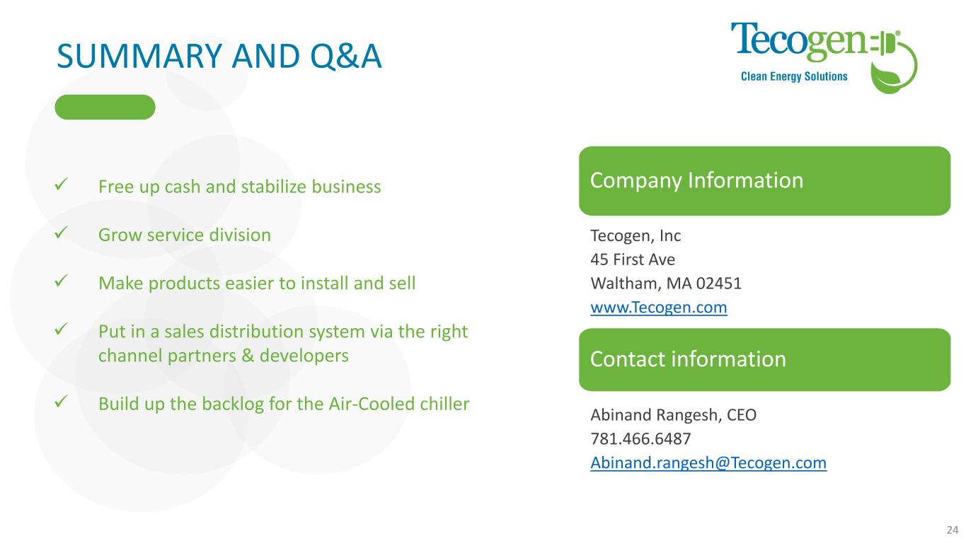 SUMMARY AND Q&A Company Information Tecogen, Inc 45 First Ave Waltham, MA 02451 www.Tecogen.com Contact information Abinand Rangesh, CEO 781.466.6487 Abinand.rangesh@Tecogen.com 24 ✓ Free up cash and stabilize business ✓ Grow service division ✓ Make products easier to install and sell ✓ Put in a sales distribution system via the right channel partners & developers ✓ Build up the backlog for the Air-Cooled chiller
