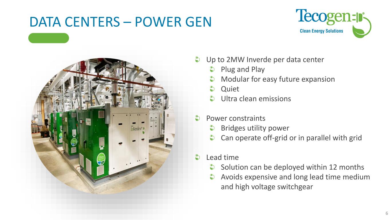 DATA CENTERS – POWER GEN 6 Up to 2MW Inverde per data center Plug and Play Modular for easy future expansion Quiet Ultra clean emissions Power constraints Bridges utility power Can operate off-grid or in parallel with grid Lead time Solution can be deployed within 12 months Avoids expensive and long lead time medium and high voltage switchgear