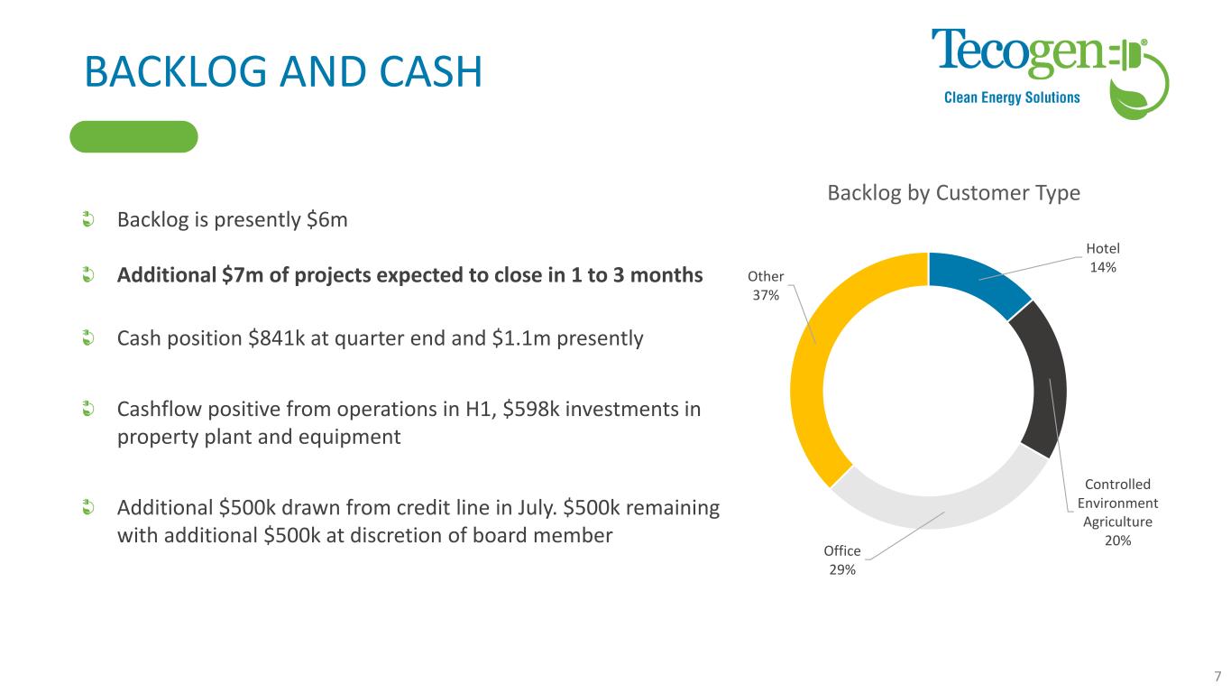 BACKLOG AND CASH Backlog is presently $6m Additional $7m of projects expected to close in 1 to 3 months Cash position $841k at quarter end and $1.1m presently Cashflow positive from operations in H1, $598k investments in property plant and equipment Additional $500k drawn from credit line in July. $500k remaining with additional $500k at discretion of board member Hotel 14% Controlled Environment Agriculture 20% Office 29% Other 37% Backlog by Customer Type 7