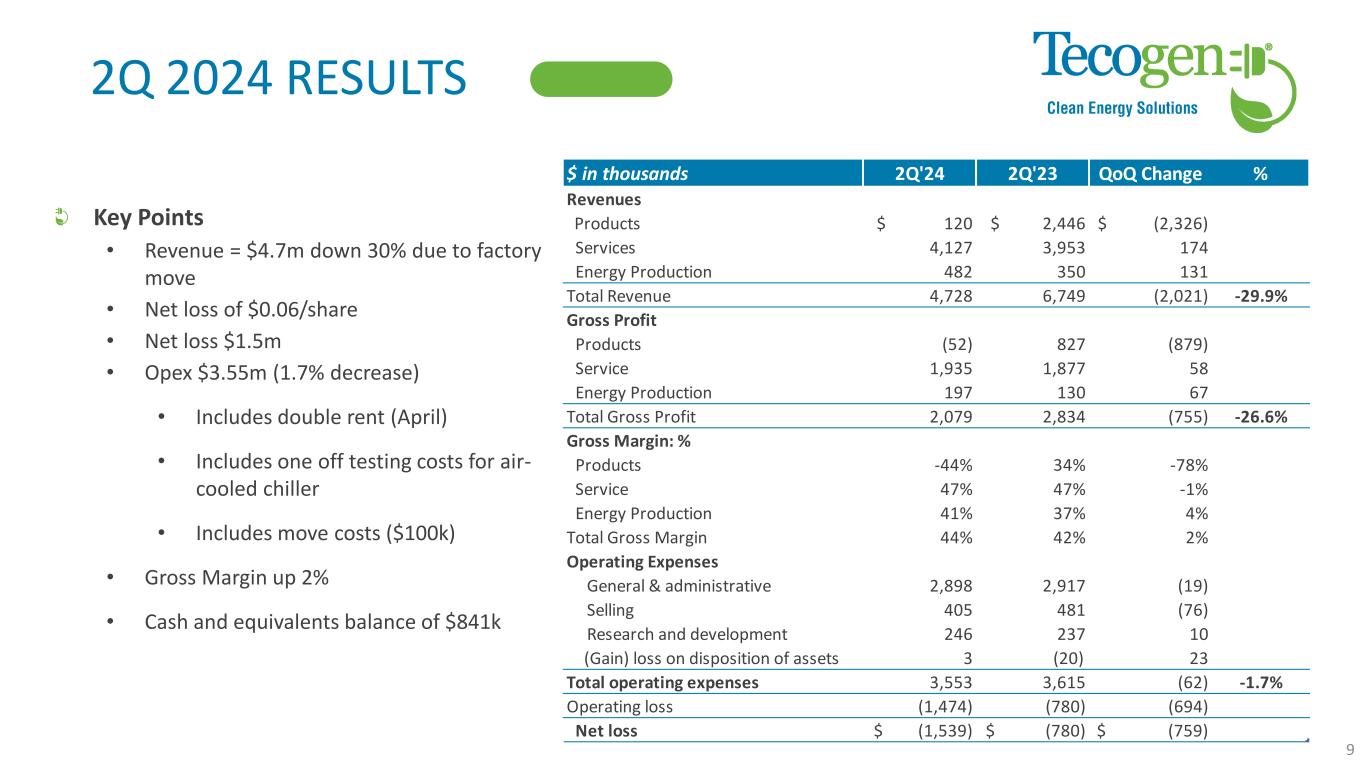 2Q 2024 RESULTS Key Points • Revenue = $4.7m down 30% due to factory move • Net loss of $0.06/share • Net loss $1.5m • Opex $3.55m (1.7% decrease) • Includes double rent (April) • Includes one off testing costs for air- cooled chiller • Includes move costs ($100k) • Gross Margin up 2% • Cash and equivalents balance of $841k 9 $ in thousands 2Q'24 2Q'23 QoQ Change % Revenues Products $ 120 $ 2,446 $ (2,326) Services 4,127 3,953 174 Energy Production 482 350 131 Total Revenue 4,728 6,749 (2,021) -29.9% Gross Profit Products (52) 827 (879) Service 1,935 1,877 58 Energy Production 197 130 67 Total Gross Profit 2,079 2,834 (755) -26.6% Gross Margin: % Products -44% 34% -78% Service 47% 47% -1% Energy Production 41% 37% 4% Total Gross Margin 44% 42% 2% Operating Expenses General & administrative 2,898 2,917 (19) Selling 405 481 (76) Research and development 246 237 10 (Gain) loss on disposition of assets 3 (20) 23 Total operating expenses 3,553 3,615 (62) -1.7% Operating loss (1,474) (780) (694) 88.9% Net loss $ (1,539) $ (780) $ (759) 97.3%