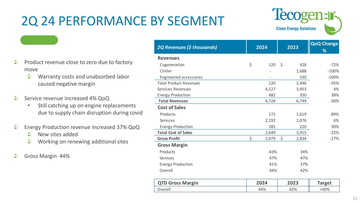 2Q 2024 ADJUSTED EBITDA RECONCILIATION EBITDA: Earnings Before Interest, Taxes, Depreciation & Amortization • EBITDA and adjusted EBITDA loss was $1.4m and $1.3m respectively EBITDA Non-cash adjustments • Stock based compensation • Unrealized and realized (gain) loss on investment securities *Adjusted EBITDA is defined as net Income (loss) attributable to Tecogen Inc, adjusted for interest, depreciation and amortization, stock-based compensation expense, unrealized loss on investment securities, non-cash abandonment of intangible assets, goodwill impairment and other non-recurring charges or gains including abandonment of certain intangible assets and extinguishment of debt 10 Non-GAAP financial disclosure (in thousands) 2024 2023 Net loss attributable to Tecogen Inc. (1,539) (780)$ Interest expense, net 18 2 Income tax expense 0 10 Depreciation & amortization, net 141 185 EBITDA (1,380) (583) Stock based compensation 45 28 Unrealized gain on marketable securities 37 (37) Adjusted EBITDA* (1,297)$ (592)$ Quarter Ended, June 30