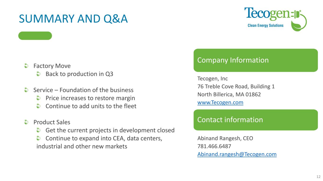 Factory Move Back to production in Q3 Service – Foundation of the business Price increases to restore margin Continue to add units to the fleet Product Sales Get the current projects in development closed Continue to expand into CEA, data centers, industrial and other new markets SUMMARY AND Q&A Company Information Tecogen, Inc 76 Treble Cove Road, Building 1 North Billerica, MA 01862 www.Tecogen.com Contact information Abinand Rangesh, CEO 781.466.6487 Abinand.rangesh@Tecogen.com 12