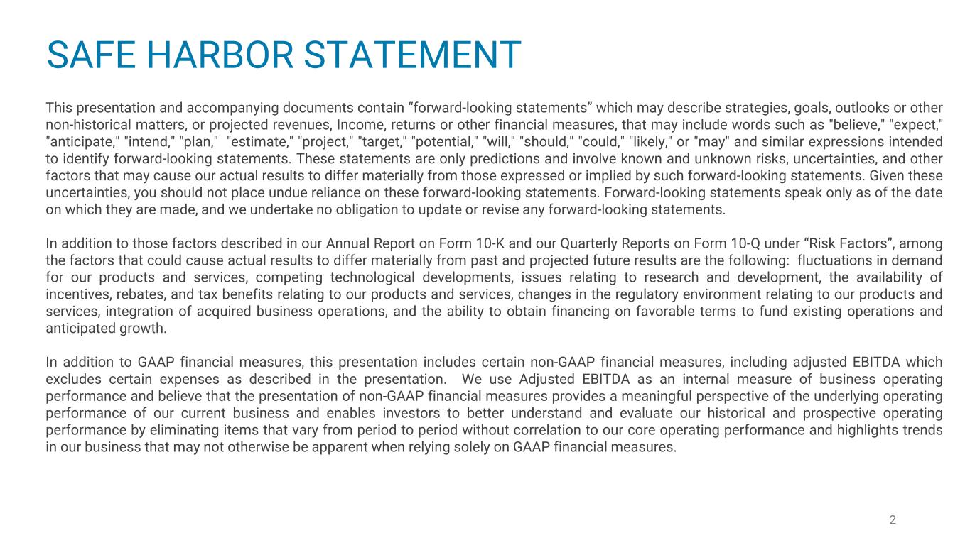 SAFE HARBOR STATEMENT This presentation and accompanying documents contain “forward-looking statements” which may describe strategies, goals, outlooks or other non-historical matters, or projected revenues, Income, returns or other financial measures, that may include words such as "believe," "expect," "anticipate," "intend," "plan," "estimate," "project," "target," "potential," "will," "should," "could," "likely," or "may" and similar expressions intended to identify forward-looking statements. These statements are only predictions and involve known and unknown risks, uncertainties, and other factors that may cause our actual results to differ materially from those expressed or implied by such forward-looking statements. Given these uncertainties, you should not place undue reliance on these forward-looking statements. Forward-looking statements speak only as of the date on which they are made, and we undertake no obligation to update or revise any forward-looking statements. In addition to those factors described in our Annual Report on Form 10-K and our Quarterly Reports on Form 10-Q under “Risk Factors”, among the factors that could cause actual results to differ materially from past and projected future results are the following: fluctuations in demand for our products and services, competing technological developments, issues relating to research and development, the availability of incentives, rebates, and tax benefits relating to our products and services, changes in the regulatory environment relating to our products and services, integration of acquired business operations, and the ability to obtain financing on favorable terms to fund existing operations and anticipated growth. In addition to GAAP financial measures, this presentation includes certain non-GAAP financial measures, including adjusted EBITDA which excludes certain expenses as described in the presentation. We use Adjusted EBITDA as an internal measure of business operating performance and believe that the presentation of non-GAAP financial measures provides a meaningful perspective of the underlying operating performance of our current business and enables investors to better understand and evaluate our historical and prospective operating performance by eliminating items that vary from period to period without correlation to our core operating performance and highlights trends in our business that may not otherwise be apparent when relying solely on GAAP financial measures. 2
