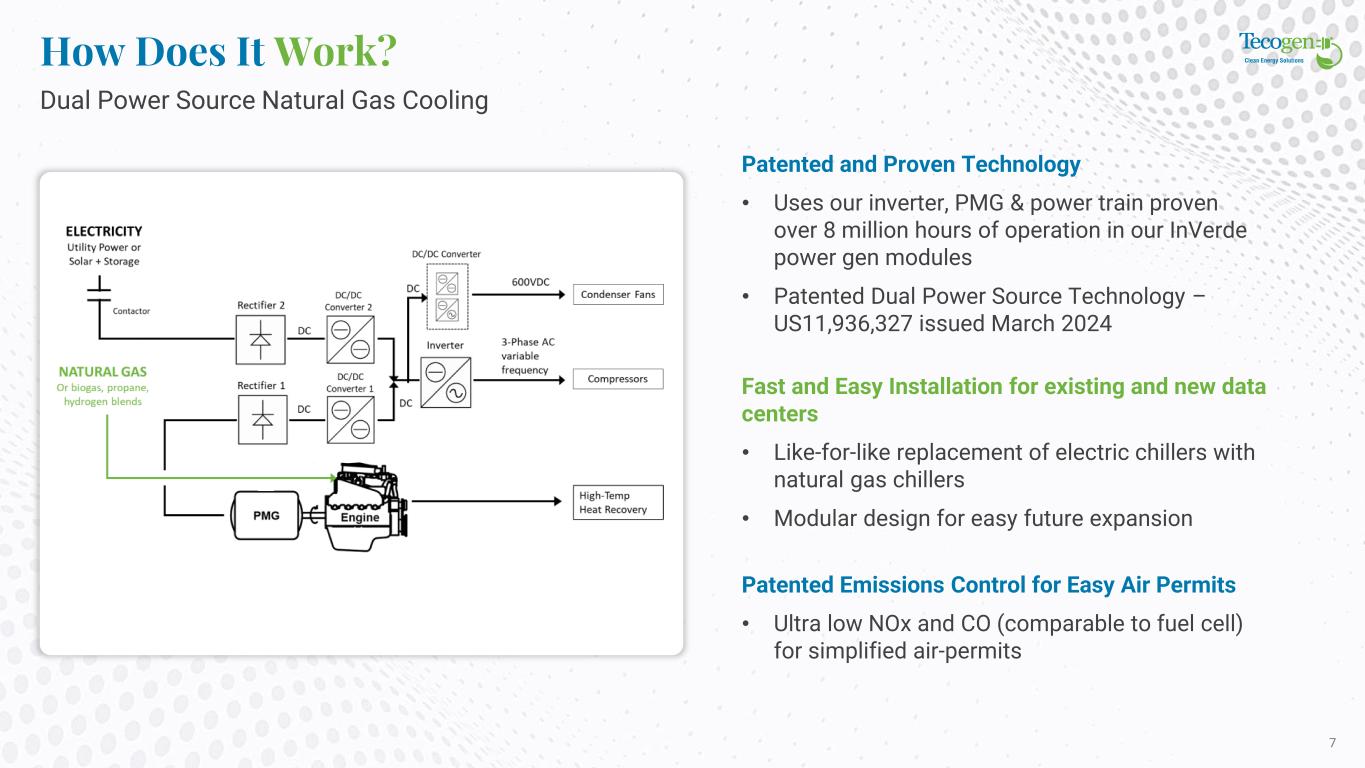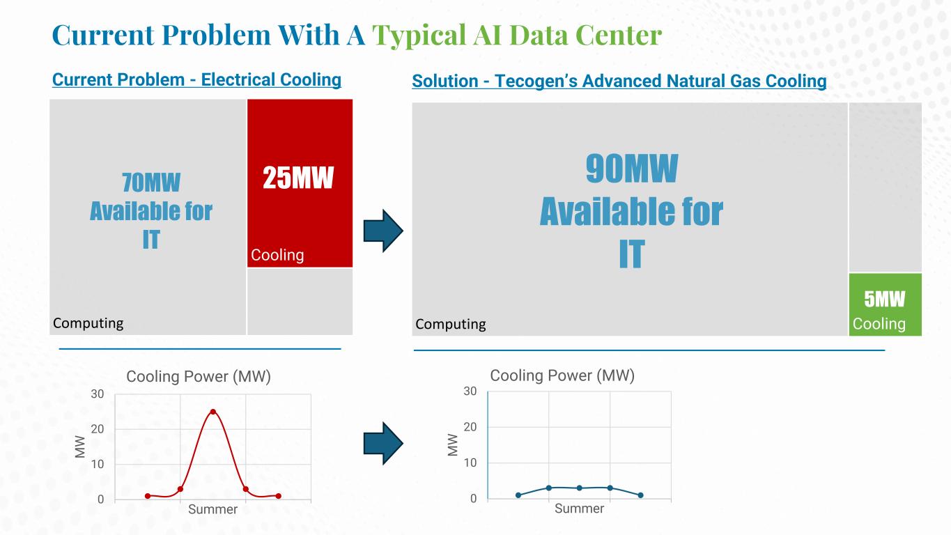 Solution - Tecogen’s Advanced Natural Gas Cooling CoolingComputing 90MW Available for IT 0 10 20 30 M W Summer Cooling Power (MW) 0 10 20 30 M W Summer Cooling Power (MW) Cooling Computing 25MW70MW Available for IT 5MW Current Problem - Electrical Cooling Current Problem With A Typical AI Data Center