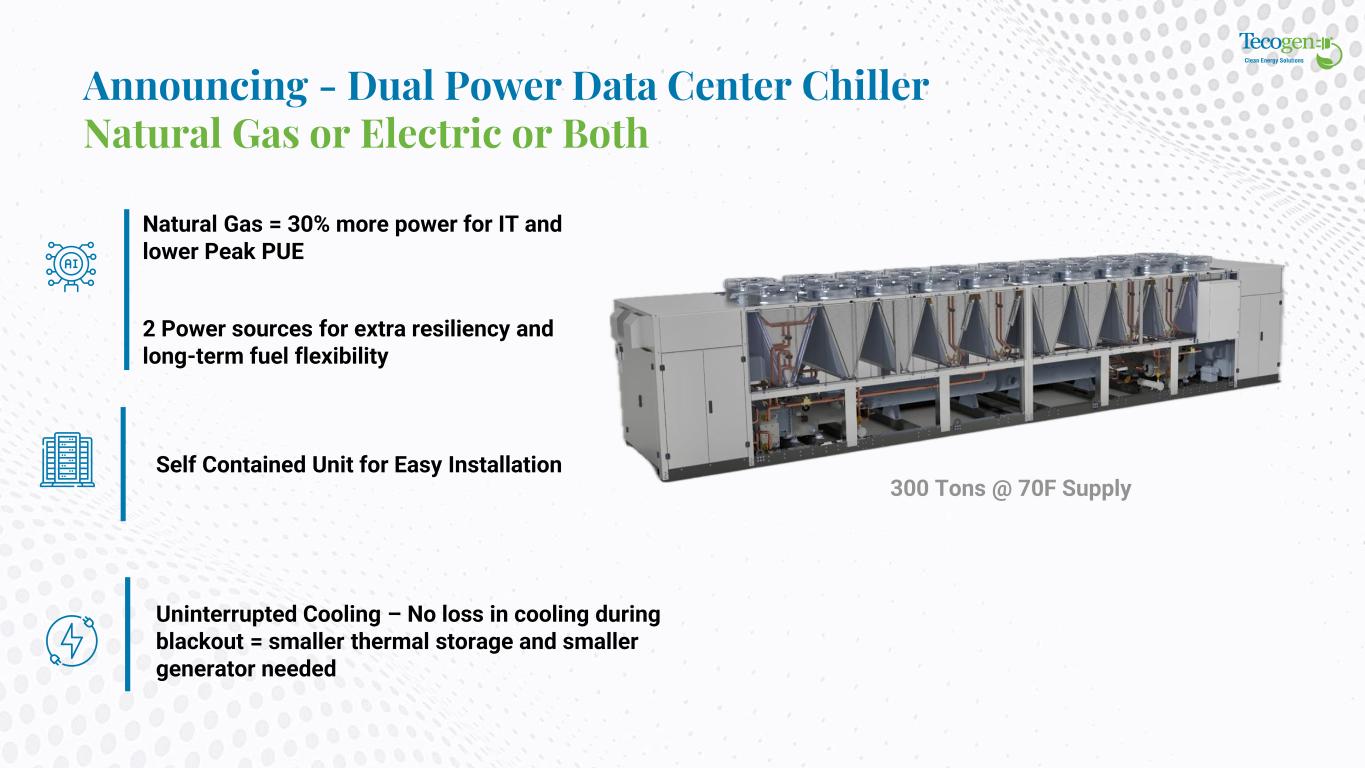 Announcing - Dual Power Data Center Chiller Natural Gas or Electric or Both Self Contained Unit for Easy Installation Natural Gas = 30% more power for IT and lower Peak PUE 2 Power sources for extra resiliency and long-term fuel flexibility Uninterrupted Cooling – No loss in cooling during blackout = smaller thermal storage and smaller generator needed 300 Tons @ 70F Supply