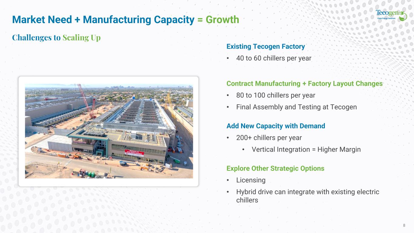 How Does It Work? Dual Power Source Natural Gas Cooling 7 Patented and Proven Technology • Uses our inverter, PMG & power train proven over 8 million hours of operation in our InVerde power gen modules • Patented Dual Power Source Technology – US11,936,327 issued March 2024 Fast and Easy Installation for existing and new data centers • Like-for-like replacement of electric chillers with natural gas chillers • Modular design for easy future expansion Patented Emissions Control for Easy Air Permits • Ultra low NOx and CO (comparable to fuel cell) for simplified air-permits