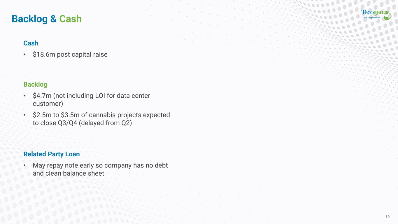 Challenges to Scaling Up Target Milestones 9 Convert LOIs to PO • Secure Pilot Project POs Vertiv Marketing • Marketing plan is finalized. Vertiv expects to start releasing in Q3 and Q4 Potential Longer Term Strategic Initiatives • Licensing and/or • Factory scale up Secure Larger Unit Order • Eliminate supply chain and capacity bottlenecks • Hope to sell manufacturing capacity to 1 or 2 projects