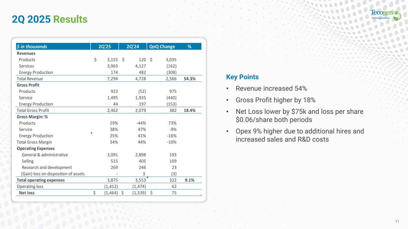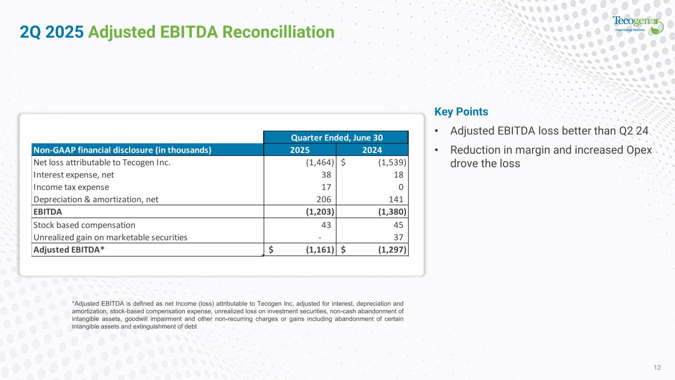 2Q 2025 Results 11 Key Points • Revenue increased 54% • Gross Profit higher by 18% • Net Loss lower by $75k and loss per share $0.06/share both periods • Opex 9% higher due to additional hires and increased sales and R&D costs $ in thousands 2Q'25 2Q'24 QoQ Change % Revenues Products $ 3,155 $ 120 $ 3,035 Services 3,965 4,127 (162) Energy Production 174 482 (308) Total Revenue 7,294 4,728 2,566 54.3% Gross Profit Products 923 (52) 975 Service 1,495 1,935 (440) Energy Production 44 197 (153) Total Gross Profit 2,462 2,079 382 18.4% Gross Margin: % Products 29% -44% 73% Service 38% 47% -9% Energy Production 25% 41% -16% Total Gross Margin 34% 44% -10% Operating Expenses General & administrative 3,091 2,898 193 Selling 515 405 109 Research and development 269 246 23 (Gain) loss on disposition of assets - 3 (3) Total operating expenses 3,875 3,553 322 9.1% Operating loss (1,412) (1,474) 62 -4.2% Net loss $ (1,464) $ (1,539) $ 75 -4.9%
