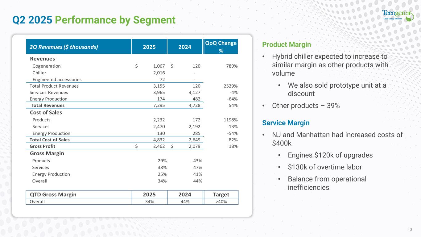 2Q 2025 Adjusted EBITDA Reconcilliation 12 Key Points • Adjusted EBITDA loss better than Q2 24 • Reduction in margin and increased Opex drove the loss Non-GAAP financial disclosure (in thousands) 2025 2024 Net loss attributable to Tecogen Inc. (1,464) (1,539)$ Interest expense, net 38 18 Income tax expense 17 0 Depreciation & amortization, net 206 141 EBITDA (1,203) (1,380) Stock based compensation 43 45 Unrealized gain on marketable securities - 37 Adjusted EBITDA* (1,161)$ (1,297)$ Quarter Ended, June 30 *Adjusted EBITDA is defined as net Income (loss) attributable to Tecogen Inc, adjusted for interest, depreciation and amortization, stock-based compensation expense, unrealized loss on investment securities, non-cash abandonment of intangible assets, goodwill impairment and other non-recurring charges or gains including abandonment of certain intangible assets and extinguishment of debt