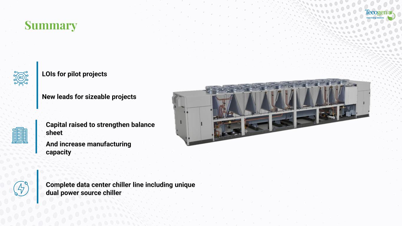 Summary Capital raised to strengthen balance sheet And increase manufacturing capacity LOIs for pilot projects New leads for sizeable projects Complete data center chiller line including unique dual power source chiller