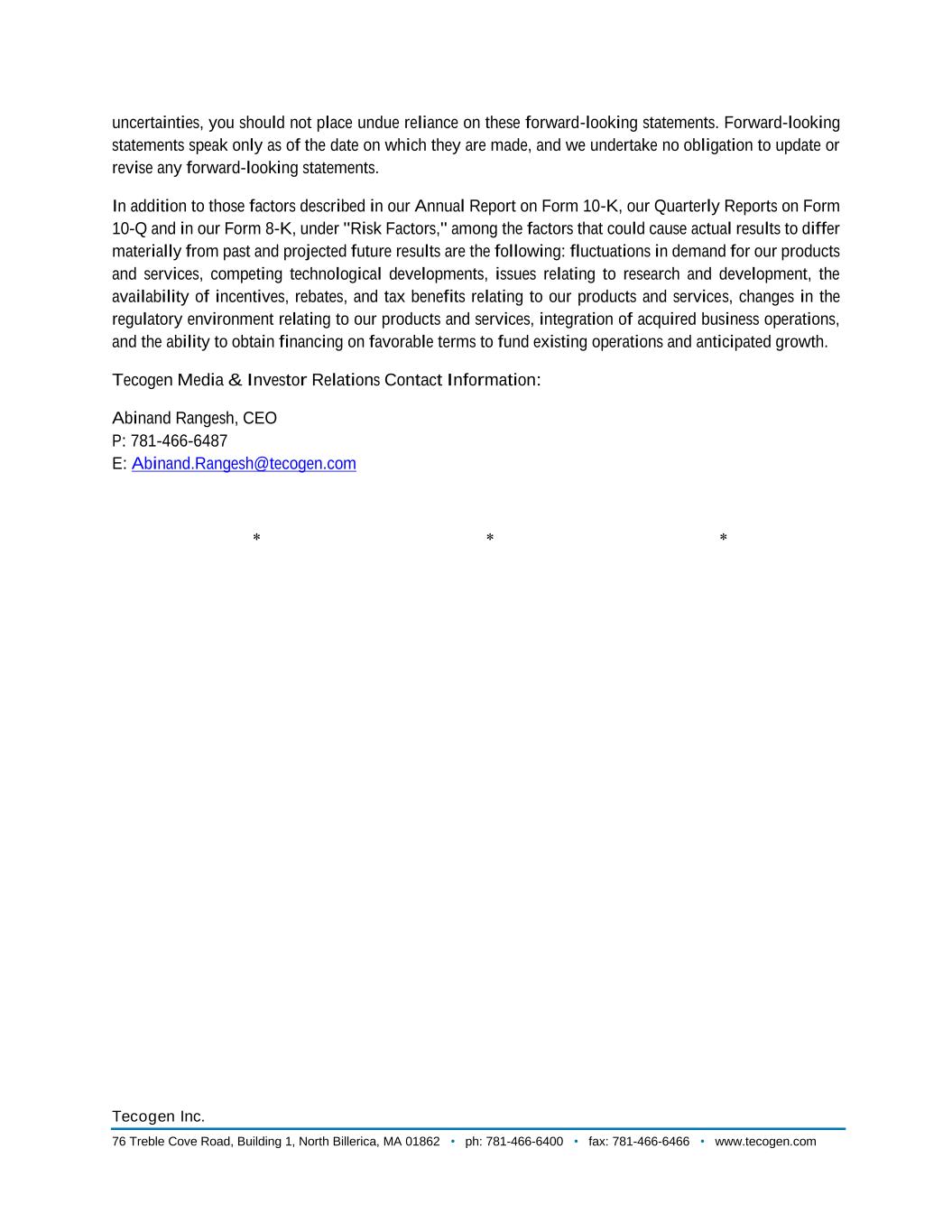 Tecogen Inc. 76 Treble Cove Road, Building 1, North Billerica, MA 01862 • ph: 781-466-6400 • fax: 781-466-6466 • www.tecogen.com uncertainties, you should not place undue reliance on these forward-looking statements. Forward-looking statements speak only as of the date on which they are made, and we undertake no obligation to update or revise any forward-looking statements. In addition to those factors described in our Annual Report on Form 10-K, our Quarterly Reports on Form 10-Q and in our Form 8-K, under "Risk Factors," among the factors that could cause actual results to differ materially from past and projected future results are the following: fluctuations in demand for our products and services, competing technological developments, issues relating to research and development, the availability of incentives, rebates, and tax benefits relating to our products and services, changes in the regulatory environment relating to our products and services, integration of acquired business operations, and the ability to obtain financing on favorable terms to fund existing operations and anticipated growth. Tecogen Media & Investor Relations Contact Information: Abinand Rangesh, CEO P: 781-466-6487 E: Abinand.Rangesh@tecogen.com * * * Capstone Turbine Corporation is the world's leading producer of highly efficient, low-emission, resilient microturbine energy systems.