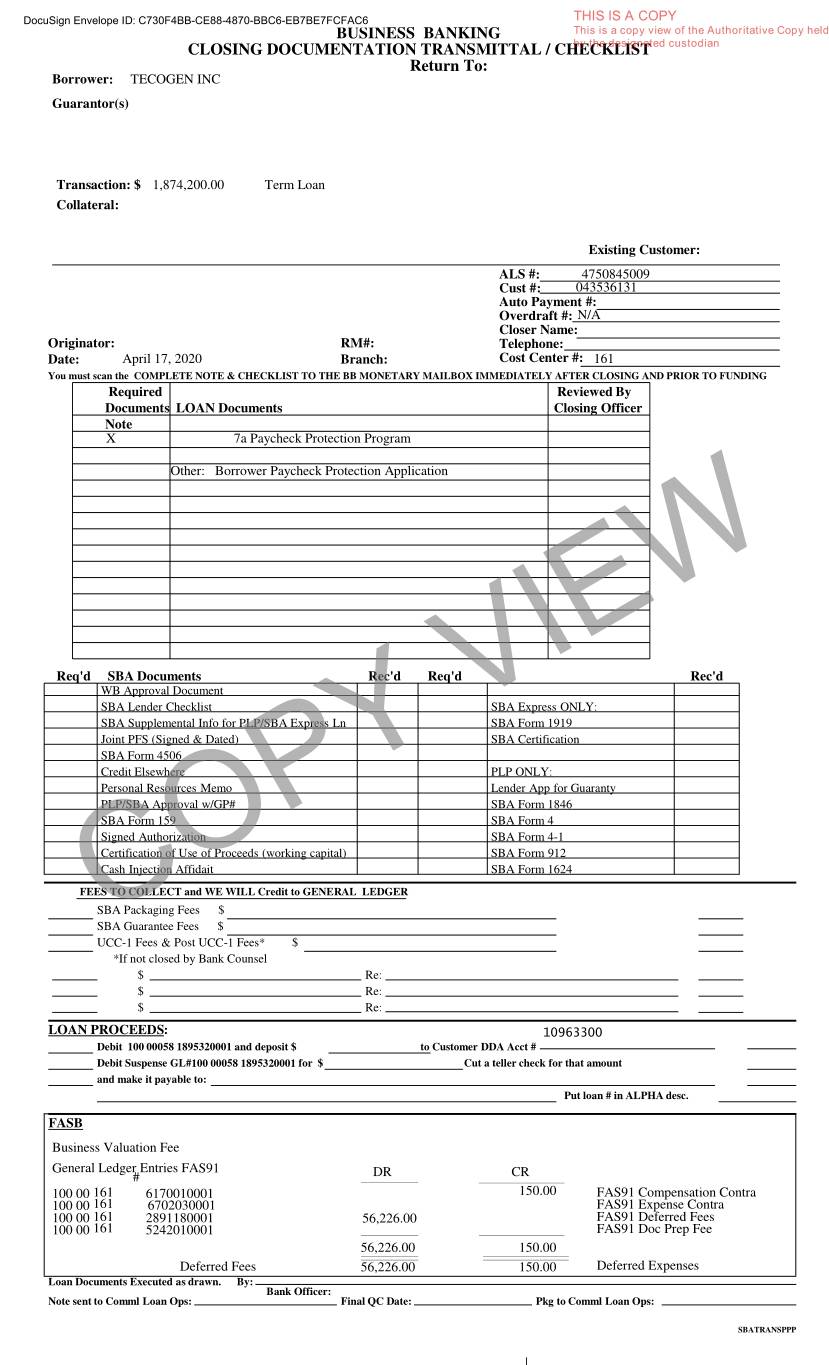 DocuSign Envelope ID: C730F4BB-CE88-4870-BBC6-EB7BE7FCFAC6 THIS IS A COPY BUSINESS BANKING This is a copy view of the Authoritative Copy held CLOSING DOCUMENTATION TRANSMITTAL / CHECKLISTby the designated custodian Return To: Borrower: TECOGEN INC Guarantor(s) Transaction: $ 1,874,200.00 Term Loan Collateral: Existing Customer: ALS #: 4750845009 Cust #: 043536131 Auto Payment #: Overdraft #: N/A Closer Name: Originator: RM#: Telephone: Date: April 17, 2020 Branch: Cost Center #: 161 You must scan the COMPLETE NOTE & CHECKLIST TO THE BB MONETARY MAILBOX IMMEDIATELY AFTER CLOSING AND PRIOR TO FUNDING Required Reviewed By Documents LOAN Documents Closing Officer Note X 7a Paycheck Protection Program Other: Borrower Paycheck Protection Application Req'd SBA Documents Rec'd Req'd Rec'd WB Approval Document SBA Lender Checklist SBA Express ONLY: SBASupplementalInfoforPLP/SBAExpressLn SBAForm1919 Joint PFS (Signed & Dated) SBA Certification SBA Form 4506 Credit Elsewhere PLP ONLY: Personal Resources Memo Lender App for Guaranty PLP/SBA Approval w/GP# SBA Form 1846 SBA Form 159 SBA Form 4 Signed Authorization SBA Form 4-1 CertificationofUseofProceeds(workingcapital) SBAForm 912 Cash Injection Affidait SBA Form 1624 FEES TO COLLECT and WE WILL Credit to GENERAL LEDGER SBA Packaging Fees $ SBACOPY Guarantee Fees $ VIEW UCC-1 Fees & Post UCC-1 Fees* $ *If not closed by Bank Counsel $ Re: $ Re: $ Re: LOAN PROCEEDS : 10963300 Debit 100000581895320001anddeposit$ toCustomerDDAAcct # DebitSuspenseGL#100000581895320001for$ Cutatellercheck for that amount and make it payable to: Put loan # in ALPHA desc. FASB Business Valuation Fee General Ledger Entries FAS91 # DR CR 100 00 161 6170010001 150.00 FAS91 Compensation Contra 100 00 161 6702030001 FAS91 Expense Contra 100 00 161 2891180001 56,226.00 FAS91 Deferred Fees 100 00 161 5242010001 FAS91 Doc Prep Fee 56,226.00 150.00 Deferred Fees 56,226.00 150.00 Deferred Expenses Loan Documents Executed as drawn. By: Bank Officer: Note sent to Comml Loan Ops: Final QC Date: Pkg to Comml Loan Ops: SBATRANSPPP