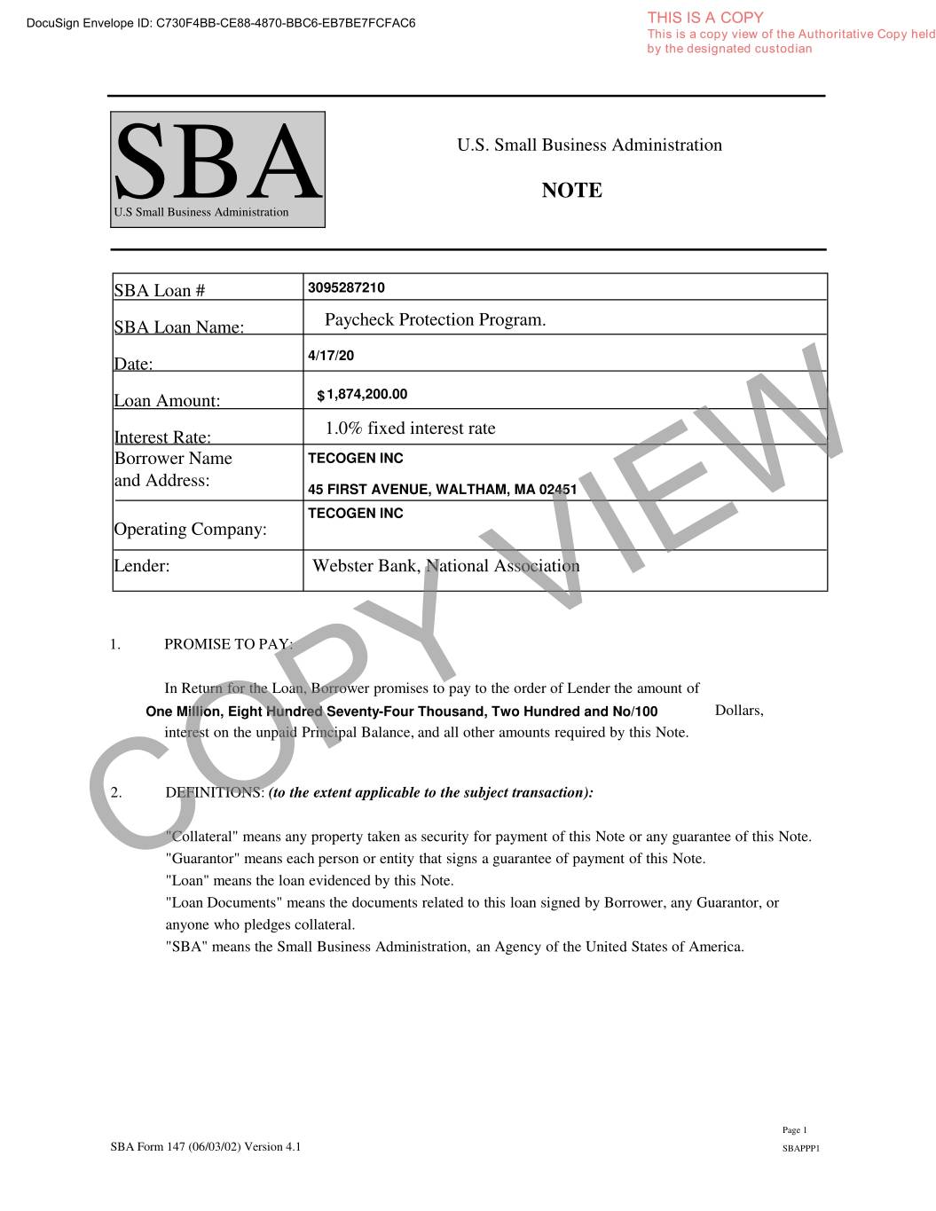 DocuSign Envelope ID: C730F4BB-CE88-4870-BBC6-EB7BE7FCFAC6 THIS IS A COPY This is a copy view of the Authoritative Copy held by the designated custodian U.S. Small Business Administration NOTE SBAU.S Small Business Administration SBA Loan # 3095287210 SBA Loan Name: Paycheck Protection Program. Date: 4/17/20 Loan Amount: $ 1,874,200.00 Interest Rate: 1.0% fixed interest rate Borrower Name TECOGEN INC and Address: 45 FIRST AVENUE, WALTHAM, MA 02451 TECOGEN INC Operating Company: Lender: Webster Bank, National Association 1. PROMISETOPAY: In Return for the Loan, Borrower promises to pay to the order of Lender the amount of One Million, Eight Hundred Seventy-Four Thousand, Two Hundred and No/100 Dollars, interest on the unpaid Principal Balance, and all other amounts required by this Note. 2. DEFINITIONS: (to the extent applicable to the subject transaction): "Collateral" means any property taken as security for payment of this Note or any guarantee of this Note. "Guarantor" means each person or entity that signs a guarantee of payment of this Note. COPY"Loan" means the loan evidenced by this Note. VIEW "Loan Documents" means the documents related to this loan signed by Borrower, any Guarantor, or anyone who pledges collateral. "SBA" means the Small Business Administration, an Agency of the United States of America. Page 1 SBA Form 147 (06/03/02) Version 4.1 SBAPPP1