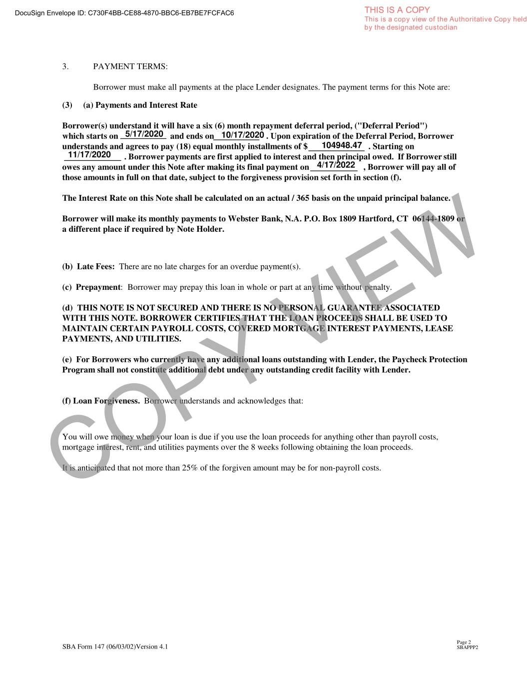 DocuSign Envelope ID: C730F4BB-CE88-4870-BBC6-EB7BE7FCFAC6 THIS IS A COPY This is a copy view of the Authoritative Copy held by the designated custodian 3. PAYMENTTERMS: Borrower must make all payments at the place Lender designates. The payment terms for this Note are: (3) (a) Payments and Interest Rate Borrower(s) understand it will have a six (6) month repayment deferral period, ("Deferral Period") which starts on 5/17/2020 and ends on 10/17/2020 . Upon expiration of the Deferral Period, Borrower understands and agrees to pay (18) equal monthly installments of $ 104948.47 . Starting on 11/17/2020 . Borrowerpayments are first applied to interest and then principal owed. If Borrower still owes any amount under this Note after making its final payment on 4/17/2022 , Borrower will pay all of those amounts in full on that date, subject to the forgiveness provision set forth in section (f). The Interest Rate on this Note shall be calculated on an actual / 365 basis on the unpaid principal balance. Borrower will make its monthly payments to Webster Bank, N.A. P.O. Box 1809 Hartford, CT 06144-1809 or a different place if required by Note Holder. (b) Late Fees: There are no late charges for an overdue payment(s). (c) Prepayment : Borrower may prepay this loan in whole or part at any time without penalty. (d) THIS NOTE IS NOT SECURED AND THERE IS NO PERSONAL GUARANTEE ASSOCIATED WITH THIS NOTE. BORROWER CERTIFIES THAT THE LOAN PROCEEDS SHALL BE USED TO MAINTAIN CERTAIN PAYROLL COSTS, COVERED MORTGAGE INTEREST PAYMENTS, LEASE PAYMENTS, AND UTILITIES. (e) For Borrowers who currently have any additional loans outstanding with Lender, the Paycheck Protection Program shall not constitute additional debt under any outstanding credit facility with Lender. (f) Loan Forgiveness. Borrower understands and acknowledges that: You will owe money when your loan is due if you use the loan proceeds for anything other than payroll costs, mortgage interest, rent, and utilities payments over the 8 weeks following obtaining the loan proceeds. It is anticipated that not more than 25% of the forgiven amount may be for non-payroll costs. COPY VIEW Page 2 SBA Form 147 (06/03/02)Version 4.1 SBAPPP2