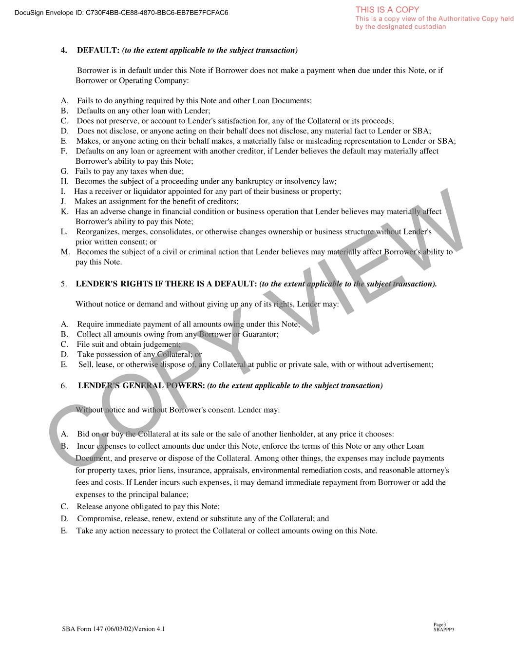 DocuSign Envelope ID: C730F4BB-CE88-4870-BBC6-EB7BE7FCFAC6 THIS IS A COPY This is a copy view of the Authoritative Copy held by the designated custodian 4. DEFAULT: (to the extent applicable to the subject transaction) Borrower is in default under this Note if Borrower does not make a payment when due under this Note, or if Borrower or Operating Company: A. Fails to do anything required by this Note and other Loan Documents; B. Defaults on any other loan with Lender; C. Does not preserve, or account to Lender's satisfaction for, any of the Collateral or its proceeds; D. Does not disclose, or anyone acting on their behalf does not disclose, any material fact to Lender or SBA; E. Makes, or anyone acting on their behalf makes, a materially false or misleading representation to Lender or SBA; F. Defaults on any loan or agreement with another creditor, if Lender believes the default may materially affect Borrower's ability to pay this Note; G. Fails to pay any taxes when due; H. Becomes the subject of a proceeding under any bankruptcy or insolvency law; I. Has a receiver or liquidator appointed for any part of their business or property; J. Makes an assignment for the benefit of creditors; K. Has an adverse change in financial condition or business operation that Lender believes may materially affect Borrower's ability to pay this Note; L. Reorganizes, merges, consolidates, or otherwise changes ownership or business structure without Lender's prior written consent; or M. Becomes the subject of a civil or criminal action that Lender believes may materially affect Borrower's ability to pay this Note. 5. LENDER'S RIGHTS IF THERE IS A DEFAULT: (to the extent applicable to the subject transaction). Without notice or demand and without giving up any of its rights, Lender may: A. Require immediate payment of all amounts owing under this Note; B. Collect all amounts owing from any Borrower or Guarantor; C. File suit and obtain judgement; D. Take possession of any Collateral; or E. Sell, lease, or otherwise dispose of, any Collateral at public or private sale, with or without advertisement; 6. LENDER'S GENERAL POWERS: (to the extent applicable to the subject transaction) Without notice and without Borrower's consent. Lender may: A. Bid on or buy the Collateral at its sale or the sale of another lienholder, at any price it chooses: B. Incur expenses to collect amounts due under this Note, enforce the terms of this Note or any other Loan Document, and preserve or dispose of the Collateral. Among other things, the expenses may include payments for property taxes, prior liens, insurance, appraisals, environmental remediation costs, and reasonable attorney's COPY fees and costs. If Lender incurs such expenses, it may demand immediateVIEW repayment from Borrower or add the expenses to the principal balance; C. Release anyone obligated to pay this Note; D. Compromise, release, renew, extend or substitute any of the Collateral; and E. Take any action necessary to protect the Collateral or collect amounts owing on this Note. Page3 SBA Form 147 (06/03/02)Version 4.1 SBAPPP3