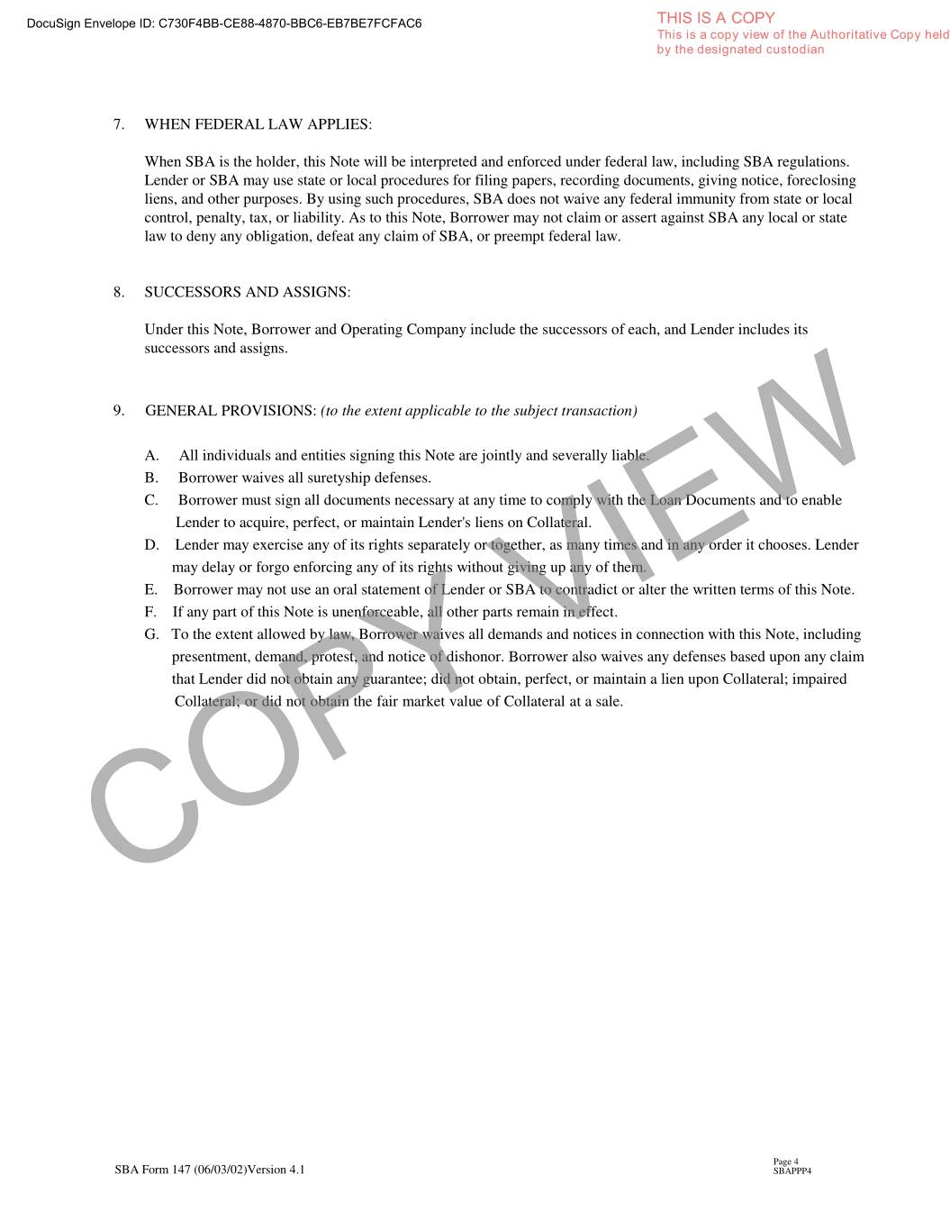 DocuSign Envelope ID: C730F4BB-CE88-4870-BBC6-EB7BE7FCFAC6 THIS IS A COPY This is a copy view of the Authoritative Copy held by the designated custodian 7. WHEN FEDERAL LAW APPLIES: When SBA is the holder, this Note will be interpreted and enforced under federal law, including SBA regulations. Lender or SBA may use state or local procedures for filing papers, recording documents, giving notice, foreclosing liens, and other purposes. By using such procedures, SBA does not waive any federal immunity from state or local control, penalty, tax, or liability. As to this Note, Borrower may not claim or assert against SBA any local or state law to deny any obligation, defeat any claim of SBA, or preempt federal law. 8. SUCCESSORS AND ASSIGNS: Under this Note, Borrower and Operating Company include the successors of each, and Lender includes its successors and assigns. 9. GENERAL PROVISIONS: (to the extent applicable to the subject transaction) A. All individuals and entities signing this Note are jointly and severally liable. B. Borrower waives all suretyship defenses. C. Borrower must sign all documents necessary at any time to comply with the Loan Documents and to enable Lender to acquire, perfect, or maintain Lender's liens on Collateral. D. Lender may exercise any of its rights separately or together, as many times and in any order it chooses. Lender may delay or forgo enforcing any of its rights without giving up any of them. E. Borrower may not use an oral statement of Lender or SBA to contradict or alter the written terms of this Note. F. If any part of this Note is unenforceable, all other parts remain in effect. G. To the extent allowed by law, Borrower waives all demands and notices in connection with this Note, including presentment, demand, protest, and notice of dishonor. Borrower also waives any defenses based upon any claim that Lender did not obtain any guarantee; did not obtain, perfect, or maintain a lien upon Collateral; impaired Collateral; or did not obtain the fair market value of Collateral at a sale. COPY VIEW Page 4 SBA Form 147 (06/03/02)Version 4.1 SBAPPP4