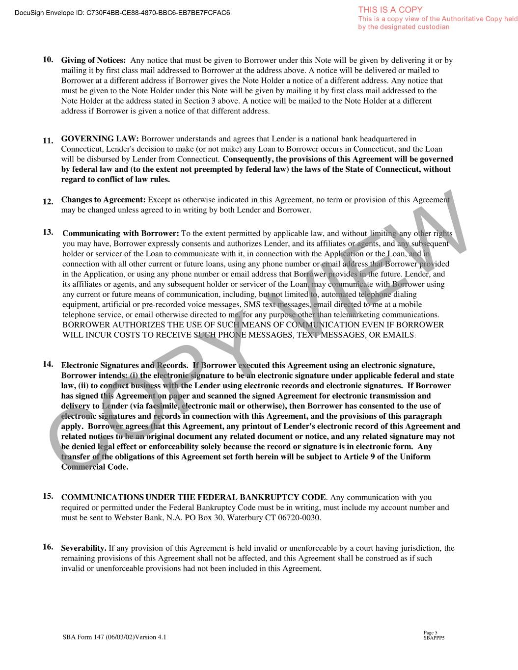 DocuSign Envelope ID: C730F4BB-CE88-4870-BBC6-EB7BE7FCFAC6 THIS IS A COPY This is a copy view of the Authoritative Copy held by the designated custodian 10. Giving of Notices: Any notice that must be given to Borrower under this Note will be given by delivering it or by mailing it by first class mail addressed to Borrower at the address above. A notice will be delivered or mailed to Borrower at a different address if Borrower gives the Note Holder a notice of a different address. Any notice that must be given to the Note Holder under this Note will be given by mailing it by first class mail addressed to the Note Holder at the address stated in Section 3 above. A notice will be mailed to the Note Holder at a different address if Borrower is given a notice of that different address. 11. GOVERNING LAW: Borrower understands and agrees that Lender is a national bank headquartered in Connecticut, Lender's decision to make (or not make) any Loan to Borrower occurs in Connecticut, and the Loan will be disbursed by Lender from Connecticut. Consequently, the provisions of this Agreement will be governed by federal law and (to the extent not preempted by federal law) the laws of the State of Connecticut, without regard to conflict of law rules. 12. Changes to Agreement: Except as otherwise indicated in this Agreement, no term or provision of this Agreement may be changed unless agreed to in writing by both Lender and Borrower. 13. Communicating with Borrower: To the extent permitted by applicable law, and without limiting any other rights you may have, Borrower expressly consents and authorizes Lender, and its affiliates or agents, and any subsequent holder or servicer of the Loan to communicate with it, in connection with the Application or the Loan, and in connection with all other current or future loans, using any phone number or email address that Borrower provided in the Application, or using any phone number or email address that Borrower provides in the future. Lender, and its affiliates or agents, and any subsequent holder or servicer of the Loan, may communicate with Borrower using any current or future means of communication, including, but not limited to, automated telephone dialing equipment, artificial or pre-recorded voice messages, SMS text messages, email directed to me at a mobile telephone service, or email otherwise directed to me, for any purpose other than telemarketing communications. BORROWER AUTHORIZES THE USE OF SUCH MEANS OF COMMUNICATION EVEN IF BORROWER WILL INCUR COSTS TO RECEIVE SUCH PHONE MESSAGES, TEXT MESSAGES, OR EMAILS. 14. Electronic Signatures and Records. If Borrower executed this Agreement using an electronic signature, Borrower intends: (i) the electronic signature to be an electronic signature under applicable federal and state law, (ii) to conduct business with the Lender using electronic records and electronic signatures. If Borrower has signed this Agreement on paper and scanned the signed Agreement for electronic transmission and delivery to Lender (via facsimile, electronic mail or otherwise), then Borrower has consented to the use of electronic signatures and records in connection with this Agreement, and the provisions of this paragraph apply. Borrower agrees that this Agreement, any printout of Lender's electronic record of this Agreement and related notices to be an original document any related document or notice, and any related signature may not be denied legal effect or enforceability solely because the record or signature is in electronic form. Any transfer of the obligations of this Agreement set forth herein will be subject to Article 9 of the Uniform CommercialCOPY Code. VIEW 15. COMMUNICATIONS UNDER THE FEDERAL BANKRUPTCY CODE . Any communication with you required or permitted under the Federal Bankruptcy Code must be in writing, must include my account number and must be sent to Webster Bank, N.A. PO Box 30, Waterbury CT 06720-0030. 16. Severability. If any provision of this Agreement is held invalid or unenforceable by a court having jurisdiction, the remaining provisions of this Agreement shall not be affected, and this Agreement shall be construed as if such invalid or unenforceable provisions had not been included in this Agreement. Page 5 SBA Form 147 (06/03/02)Version 4.1 SBAPPP5