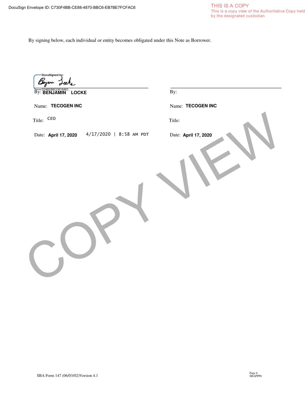 DocuSign Envelope ID: C730F4BB-CE88-4870-BBC6-EB7BE7FCFAC6 THIS IS A COPY This is a copy view of the Authoritative Copy held by the designated custodian By signing below, each individual or entity becomes obligated under this Note as Borrower. By: BENJAMIN LOCKE By: Name: TECOGEN INC Name: TECOGEN INC Title: CEO Title: Date: April 17, 2020 4/17/2020 | 8:58 AM PDT Date: April 17, 2020 COPY VIEW Page 6 SBA Form 147 (06/03/02)Version 4.1 SBAPPP6