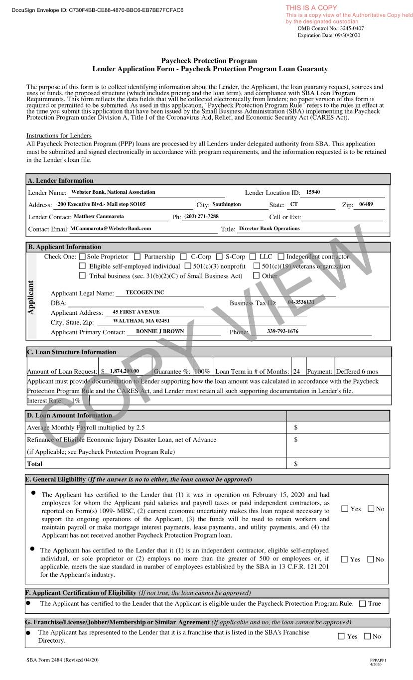 DocuSign Envelope ID: C730F4BB-CE88-4870-BBC6-EB7BE7FCFAC6 THIS IS A COPY This is a copy view of the Authoritative Copy held by the designated custodian OMB Control No.: 3245-0407 Expiration Date: 09/30/2020 Paycheck Protection Program Lender Application Form - Paycheck Protection Program Loan Guaranty The purpose of this form is to collect identifying information about the Lender, the Applicant, the loan guaranty request, sources and uses of funds, the proposed structure (which includes pricing and the loan term), and compliance with SBA Loan Program Requirements. This form reflects the data fields that will be collected electronically from lenders; no paper version of this form is required or permitted to be submitted. As used in this application, "Paycheck Protection Program Rule" refers to the rules in effect at the time you submit this application that have been issued by the Small Business Administration (SBA) implementing the Paycheck Protection Program under Division A, Title I of the Coronavirus Aid, Relief, and Economic Security Act (CARES Act). Instructions for Lenders All Paycheck Protection Program (PPP) loans are processed by all Lenders under delegated authority from SBA. This application must be submitted and signed electronically in accordance with program requirements, and the information requested is to be retained in the Lender's loan file. A. Lender Information Lender Name: Webster Bank, National Association Lender Location ID: 15940 Address: 200 Executive Blvd.- Mail stop SO105City: Southington State: CT Zip: 06489 Lender Contact:Matthew Cammarota Ph: (203) 271-7288 Cell or Ext: Contact Email: MCammarota@WebsterBank.com Title: Director Bank Operations B. Applicant Information Check One: Sole Proprietor Partnership C-Corp S-Corp LLC Independent contractor Eligible self-employed individual 501(c)(3) nonprofit 501(c)(19) veterans organization Tribal business (sec. 31(b)(2)(C) of Small Business Act) Other Applicant Legal Name: TECOGEN INC DBA: Business Tax ID: 04-3536131 45 FIRST AVENUE Applicant Applicant Address: City, State, Zip: WALTHAM, MA 02451 Applicant Primary Contact:BONNIE J BROWN Phone: 339-793-1676 C. Loan Structure Information AmountofLoanRequest: $1,874,200.00 Guarantee%: 100% LoanTermin#ofMonths: 24 Payment: Deffered 6 mos Applicant must provide documentation to Lender supporting how the loan amount was calculated in accordance with the Paycheck Protection Program Rule and the CARES Act, and Lender must retain all such supporting documentation in Lender's file. Interest Rate: 1% D. Loan Amount Information Average Monthly Payroll multiplied by 2.5 $ Refinance of Eligible Economic Injury Disaster Loan, net of Advance $ (if Applicable; see Paycheck Protection Program Rule) Total COPY VIEW$ E. General Eligibility (If the answer is no to either, the loan cannot be approved ) . The Applicant has certified to the Lender that (1) it was in operation on February 15, 2020 and had employees for whom the Applicant paid salaries and payroll taxes or paid independent contractors, as reported on Form(s) 1099- MISC, (2) current economic uncertainty makes this loan request necessary to Yes No support the ongoing operations of the Applicant, (3) the funds will be used to retain workers and maintain payroll or make mortgage interest payments, lease payments, and utility payments, and (4) the Applicant has not received another Paycheck Protection Program loan. . The Applicant has certified to the Lender that it (1) is an independent contractor, eligible self-employed individual, or sole proprietor or (2) employs no more than the greater of 500 or employees or, if Yes No applicable, meets the size standard in number of employees established by the SBA in 13 C.F.R. 121.201 for the Applicant's industry. F. Applicant Certification of Eligibility (If not true, the loan cannot be approved) . The Applicant has certified to the Lender that the Applicant is eligible under the Paycheck Protection Program Rule. True G. Franchise/License/Jobber/Membership or Similar Agreement (If applicable and no, the loan cannot be approved) The Applicant has represented to the Lender that it is a franchise that is listed in the SBA's Franchise . Yes No Directory. SBA Form 2484 (Revised 04/20) PPPAPP1 4/2020
