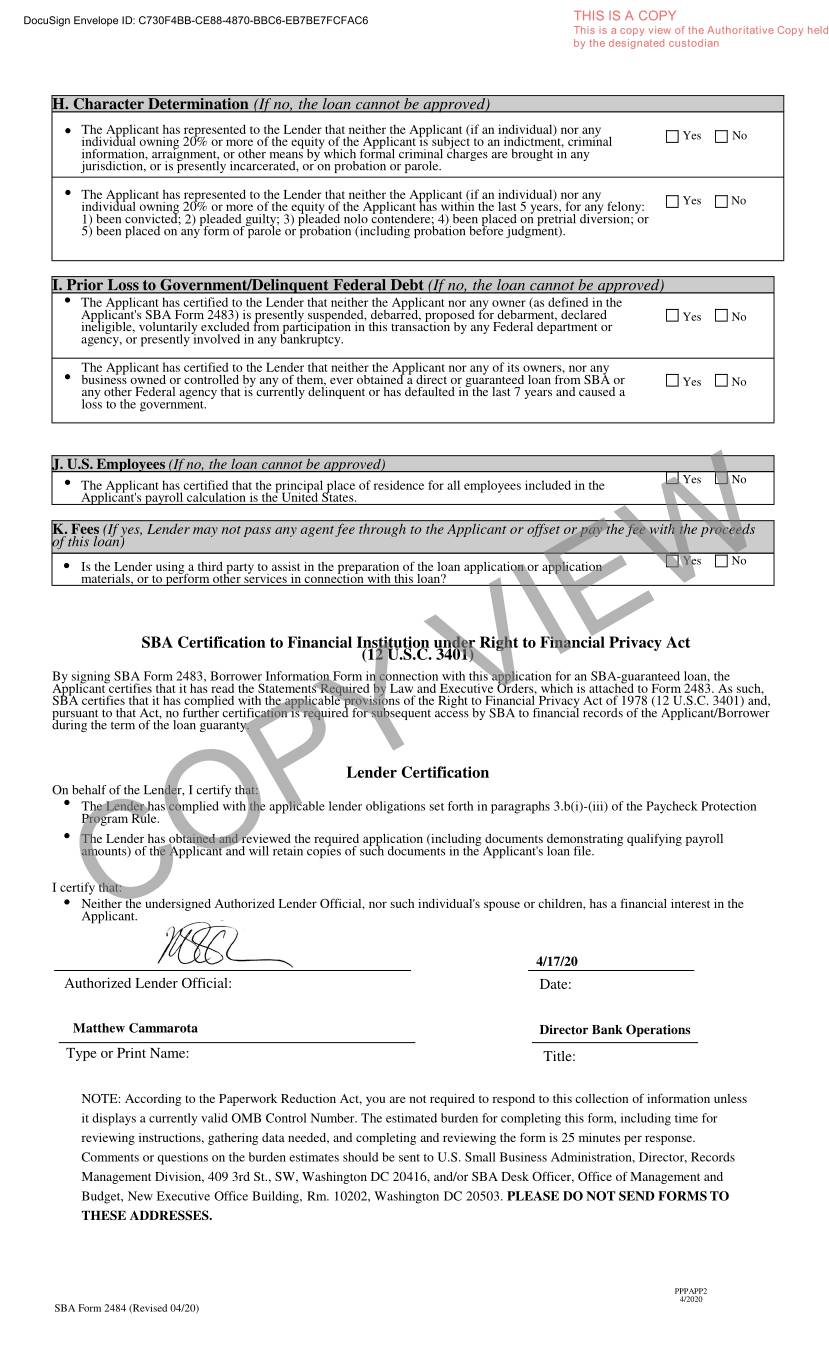 DocuSign Envelope ID: C730F4BB-CE88-4870-BBC6-EB7BE7FCFAC6 THIS IS A COPY This is a copy view of the Authoritative Copy held by the designated custodian H. Character Determination (If no, the loan cannot be approved) . The Applicant has represented to the Lender that neither the Applicant (if an individual) nor any Yes No individual owning 20% or more of the equity of the Applicant is subject to an indictment, criminal information, arraignment, or other means by which formal criminal charges are brought in any jurisdiction, or is presently incarcerated, or on probation or parole. . The Applicant has represented to the Lender that neither the Applicant (if an individual) nor any individual owning 20% or more of the equity of the Applicant has within the last 5 years, for any felony: Yes No 1) been convicted; 2) pleaded guilty; 3) pleaded nolo contendere; 4) been placed on pretrial diversion; or 5) been placed on any form of parole or probation (including probation before judgment). I. Prior Loss to Government/Delinquent Federal Debt (If no, the loan cannot be approved) . The Applicant has certified to the Lender that neither the Applicant nor any owner (as defined in the Applicant's SBA Form 2483) is presently suspended, debarred, proposed for debarment, declared Yes No ineligible, voluntarily excluded from participation in this transaction by any Federal department or agency, or presently involved in any bankruptcy. The Applicant has certified to the Lender that neither the Applicant nor any of its owners, nor any . business owned or controlled by any of them, ever obtained a direct or guaranteed loan from SBA or Yes No any other Federal agency that is currently delinquent or has defaulted in the last 7 years and caused a loss to the government. J. U.S. Employees (If no, the loan cannot be approved) . The Applicant has certified that the principal place of residence for all employees included in the Yes No Applicant's payroll calculation is the United States. K. Fees (If yes, Lender may not pass any agent fee through to the Applicant or offset or pay the fee with the proceeds of this loan) . Is the Lender using a third party to assist in the preparation of the loan application or application Yes No materials, or to perform other services in connection with this loan? SBA Certification to Financial Institution under Right to Financial Privacy Act (12 U.S.C. 3401) By signing SBA Form 2483, Borrower Information Form in connection with this application for an SBA-guaranteed loan, the Applicant certifies that it has read the Statements Required by Law and Executive Orders, which is attached to Form 2483. As such, SBA certifies that it has complied with the applicable provisions of the Right to Financial Privacy Act of 1978 (12 U.S.C. 3401) and, pursuant to that Act, no further certification is required for subsequent access by SBA to financial records of the Applicant/Borrower during the term of the loan guaranty. Lender Certification On behalf of the Lender, I certify that: . The Lender has complied with the applicable lender obligations set forth in paragraphs 3.b(i)-(iii) of the Paycheck Protection Program Rule. . The Lender has obtained and reviewed the required application (including documents demonstrating qualifying payroll amounts) of the Applicant and will retain copies of such documents in the Applicant's loan file. I certify that: . Neither the undersigned Authorized Lender Official, nor such individual's spouse or children, has a financial interest in the Applicant.COPY VIEW 4/17/20 Authorized Lender Official: Date: Matthew Cammarota Director Bank Operations Type or Print Name: Title: NOTE: According to the Paperwork Reduction Act, you are not required to respond to this collection of information unless it displays a currently valid OMB Control Number. The estimated burden for completing this form, including time for reviewing instructions, gathering data needed, and completing and reviewing the form is 25 minutes per response. Comments or questions on the burden estimates should be sent to U.S. Small Business Administration, Director, Records Management Division, 409 3rd St., SW, Washington DC 20416, and/or SBA Desk Officer, Office of Management and Budget, New Executive Office Building, Rm. 10202, Washington DC 20503. PLEASE DO NOT SEND FORMS TO THESE ADDRESSES. PPPAPP2 4/2020 SBA Form 2484 (Revised 04/20)