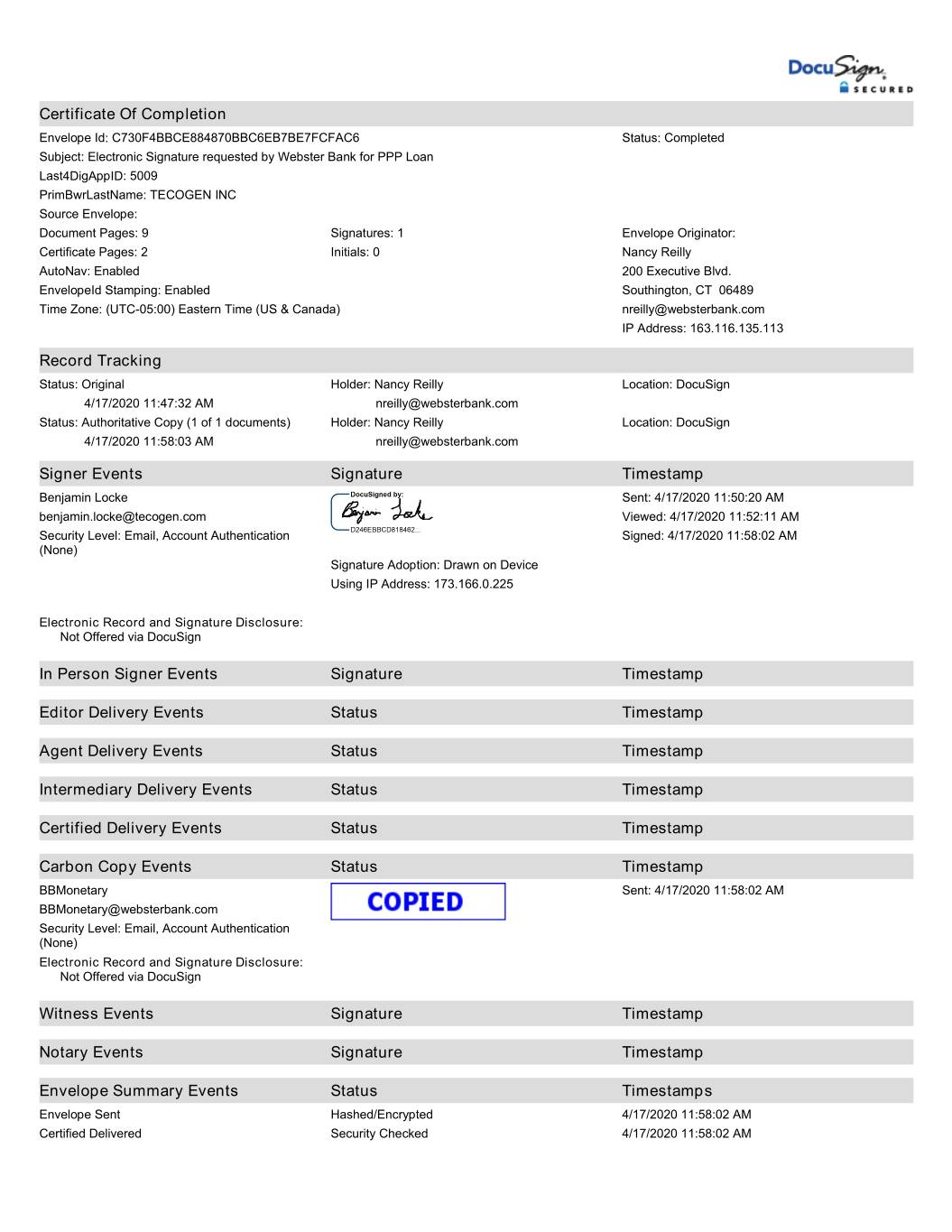 Certificate Of Completion Envelope Id: C730F4BBCE884870BBC6EB7BE7FCFAC6 Status: Completed Subject: Electronic Signature requested by Webster Bank for PPP Loan Last4DigAppID: 5009 PrimBwrLastName: TECOGEN INC Source Envelope: Document Pages: 9 Signatures: 1 Envelope Originator: Certificate Pages: 2 Initials: 0 Nancy Reilly AutoNav: Enabled 200 Executive Blvd. EnvelopeId Stamping: Enabled Southington, CT 06489 Time Zone: (UTC-05:00) Eastern Time (US & Canada) nreilly@websterbank.com IP Address: 163.116.135.113 Record Tracking Status: Original Holder: Nancy Reilly Location: DocuSign 4/17/2020 11:47:32 AM nreilly@websterbank.com Status: Authoritative Copy (1 of 1 documents) Holder: Nancy Reilly Location: DocuSign 4/17/2020 11:58:03 AM nreilly@websterbank.com Signer Events Signature Timestamp Benjamin Locke Sent: 4/17/2020 11:50:20 AM benjamin.locke@tecogen.com Viewed: 4/17/2020 11:52:11 AM Security Level: Email, Account Authentication Signed: 4/17/2020 11:58:02 AM (None) Signature Adoption: Drawn on Device Using IP Address: 173.166.0.225 Electronic Record and Signature Disclosure: Not Offered via DocuSign In Person Signer Events Signature Timestamp Editor Delivery Events Status Timestamp Agent Delivery Events Status Timestamp Intermediary Delivery Events Status Timestamp Certified Delivery Events Status Timestamp Carbon Copy Events Status Timestamp BBMonetary Sent: 4/17/2020 11:58:02 AM BBMonetary@websterbank.com Security Level: Email, Account Authentication (None) Electronic Record and Signature Disclosure: Not Offered via DocuSign Witness Events Signature Timestamp Notary Events Signature Timestamp Envelope Summary Events Status Timestamps Envelope Sent Hashed/Encrypted 4/17/2020 11:58:02 AM Certified Delivered Security Checked 4/17/2020 11:58:02 AM