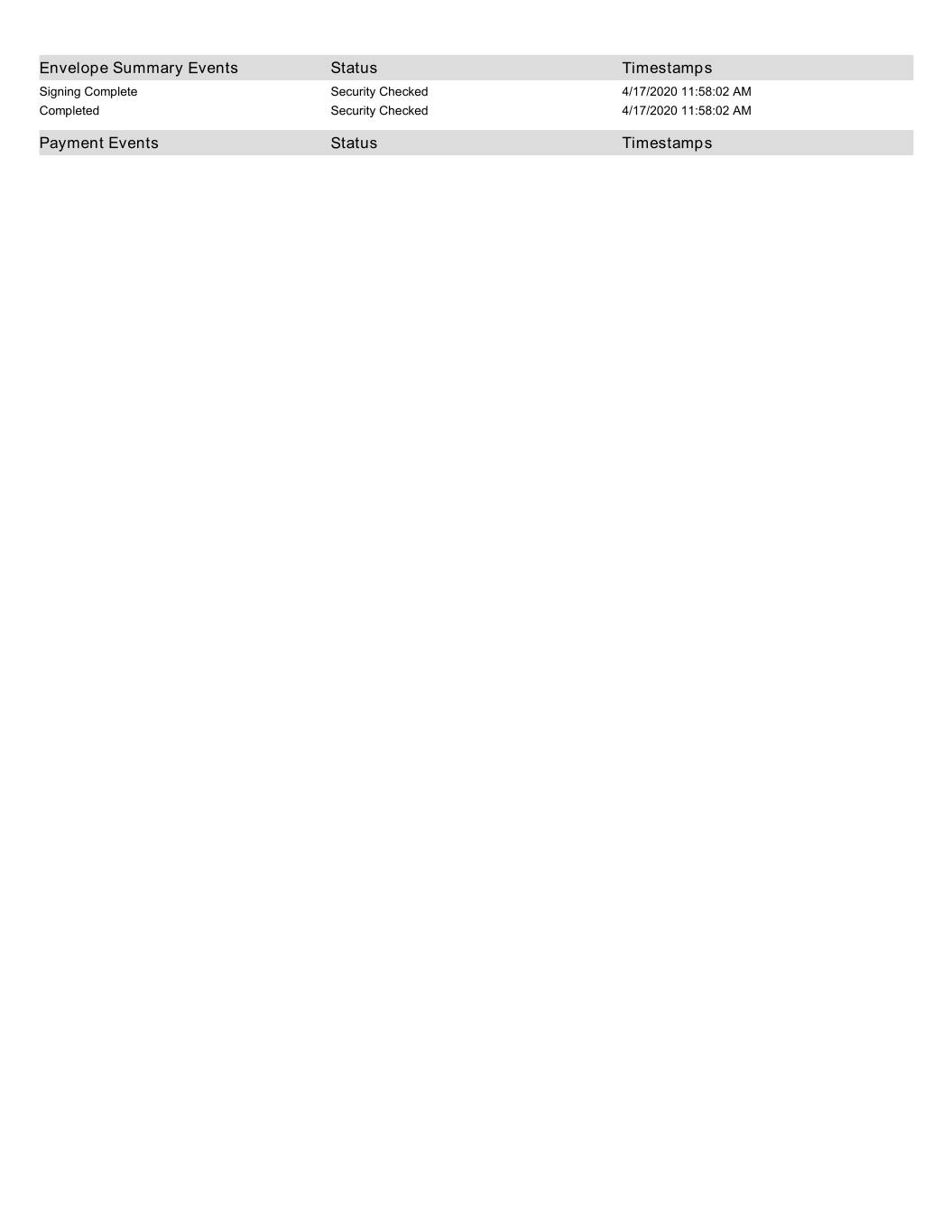 Envelope Summary Events Status Timestamps Signing Complete Security Checked 4/17/2020 11:58:02 AM Completed Security Checked 4/17/2020 11:58:02 AM Payment Events Status Timestamps